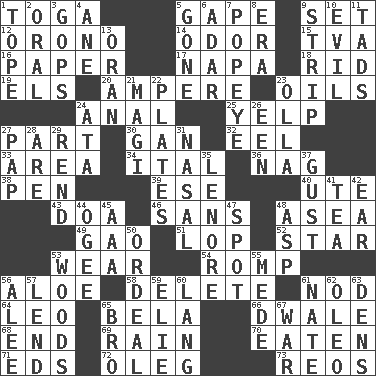 ACROSS 1. Ancient Roman robe 5. Stare wonderingly 9. Arrange properly for use 12. U. of Maine site 14. Scent 15. Federal power corp. 16. Some stationery 17. California wine valley 18. To free from 19. Raised railways 20. Electrical Unit 23. Petroleums 24. Of or related to the anus 25. Sharp bark 27. Role in a play 30. Separate the seeds from cotton 32. Snakelike fish 33. Length times width 34. Slanted text style (abbr.) 36. Tired old horse 38. Fenced enclosure 39. Compass dir. 40. Shoshoni 43. ___ good deed 46. Without 48. Toward the sea 49. E Mali city 51. Chop off 52. Play the lead 53. Erode 54. Play 56. _ vera 58. Erase 61. Dreamland 64. Lion 65. Actor Lugosi 66. A sleeping potion; an opiate (poet.) 68. Conclude 69. Water falling in drops from the sky 70. Eroded 71. Begley and Asner 72. Cassini of fashion 73. Vintage cars DOWN 1. Drink excessively 2. Spoken 3. Republicans 4. One (Scot) 5. Went 6. The sixth month of the Jewish calendar 7. Wimpy's pal 8. Period 9. Remove all contents or possession from 10. Morally bad or wrong 11. Small boys 13. NW Algerian seaport 21. Wise men 22. Food holders 23. Water jar 24. "One Day ___ Time" 26. Car or cant ending 27. Infant food 28. "We ___ not amused" (Victoria) 29. Tear apart 31. Relating to the nose 35. Poe poem 37. Abrupt rush of wind 41. Afternoon social gathering 42. Hearing organ 44. Double curve, resembling the letter S 45. American Automobile Association (abbr.) 47. Specific locale 48. Cleo's killer 50. Severe or trying experience 53. Forest 55. Ancient Persian 56. Toward shelter 57. Grant temporary use of 59. Writer Wiesel 60. Long (Scottish) 61. Nathan's nickname 62. Butter sub 63. Habitations of wild animals 65. Sis' sibling 67. Armed conflict