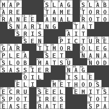 ACROSS 1. Atlas unit 4. Volcanic refuse 8. Broad, flat, thick piece 12. "We ___ not amused" (Victoria) 13. Docile 14. "Corrida" creature 15. Indian princess (variant) 18. Of or related to the anus 19. Printing process, for short 20. Catching in a trap 22. Make lace 23. Indian titles of respect 24. Small island 25. Elected rep. 26. Photo 30. Slender fish 33. The easternmost of the Lesser Sundas 36. Cassini of fashion 37. Entreaty 39. Put into a specified state 40. Nanny 41. Oscar Madison type 42. Taiwanese island in East China Sea 44. Dreamland 45. More impudent 47. Tired old horse 50. Petroleum 51. Capri or Wright 53. Connecticut Ivy Leaguer 54. Modes 57. Shade of tan 59. Sew up the eyelids of hawks and falcons 61. Sends forth 63. Specific locale 64. Angers 65. Small child 66. Relaxation 67. Assign a rank or rating to 68. Health resort DOWN 1. Impair 2. Caspian sea tributary 3. Actor Sean's family 4. Comedian Laurel of Laurel & Hardy 5. Austrian-born American filmmaker Fritz 6. Wet nurse (var.) 7. Set 8. Ski resort town in Vermont 9. Plunder 10. Tate display 11. Sometimes accompanies a hiss 16. Hearing organs 17. One of the Great Lakes 21. Is not 22. Nervous spasm 24. Wind 26. Cooking vessels 27. ____ Bator 28. Former U.S. Attorney General Janet 29. Mild oath 30. Global Positioning Systems (abbr.) 31. Silent film actress Nazimova 32. Vintage cars 34. Austrian river, tributary to the Danube 35. Was introduced to 38. Utter; complete 42. Cartoonist voice _ Blanc 43. A single undivided whole 46. One more than two 48. American tennis player Robert 49. Take by theft 52. Prepares for publication 53. Greek god of love 54. Confront 55. Otherwise 56. Close up, plug up 57. Compass dir. 58. Tax preparer (abbr.) 59. Title for a knight 60. Period 62. R.R. building