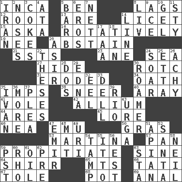 ACROSS 1. South American Indian 5. Benjamin's nick name 8. Falls behind 12. Carrot, for example 13. "We ___ not amused" (Victoria) 14. It is permitted: Lat. 15. "____ silly question..." 16. Rotating or pertaining to rotation 19. Born 20. Choose not to consume 21. Fast planes 23. A saturated hydrocarbon 24. Ocean 27. Flintstone garb 30. College mil. group 31. Eaten away 34. Pledge 35. Naughty children 38. Scornful expression 40. Like ___ of sunshine 41. Short-tailed, large-bodied rat 42. Plant genus of onion and garlic 44. Ancient Greek god of war 45. Old wives' tales, e.g. 46. Teachers' org. 47. Australian flightless bird 50. Pate de foie ____ 53. Chrissie's court nemesis 57. Baking dish 59. Appease 63. Trig term 64. Bake eggs in their shells 65. Mountains (abbr.) 66. Jacques of French films 67. Lacquered or enameled metalware 68. Plant holder 69. Of or related to the anus DOWN 1. SW Asia republic 2. Olfactory organs 3. Popular sodas 4. _ moment's notice (2 wds.) 5. Sharp remark 6. Greek god of love 7. Remaining after all deductions 8. 54 in ancient Rome 9. Adept person 10. Set 11. Filthy place 14. Actor's bit 17. Auto club (abbr.) 18. Shallow baking pan 20. SW Saudi Arabia district 22. College papers 24. Fly high 25. Singer James 26. Painful 28. Two (Sp.) 29. Pulitzer Prize-winning author Ferber 30. Nomad 32. Snakelike fish 33. Small valley 35. "Terrible" tsar 36. Greater amount 37. Entreaty 39. _ de Janeiro 43. Capital and largest city of Mongolia 47. Arab leader 48. Floor protector 49. RI univ. 51. Bee-related 52. Before Barbara or Clara 54. Pack (down) 55. "Tell ____ the Marines!" 56. A home for chicks 58. Famous astronaut Armstrong 59. Pacific Standard Time (abbr.) 60. 17th letter of the Greek alphabet 61. Lubricate 62. Before (prefix) 63. R.R. building
