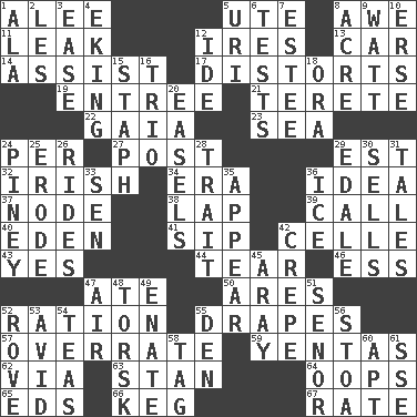 ACROSS 1. Toward shelter 5. Shoshoni 8. Deep reverence 11. Path through which fluid escapes 12. Angers 13. Automobile 14. Aid 17. What propaganda does 19. Main course 21. Cigar-shaped 22. Greek goddess of the earth (variant) 23. Ocean 24. For each 27. Mail 29. Eastern Standard Time (abbr.) 32. From or relating to Ireland 34. Epoch 36. The content of cognition 37. Connecting point 38. Pet locale 39. Give a ring to 40. Genesis locale 41. Small drink 42. Cell (Danish) 43. Affirmative reply 44. Rend 46. Double-curved letter 47. Had dinner 50. Ancient Greek god of war 52. Food allowance for one day 55. Window treatments 57. Make much ado about nothing 59. Gossips 62. By way of 63. Comedian Laurel of Laurel & Hardy 64. I made a mistake 65. Begley and Asner 66. Cask 67. Pace DOWN 1. Insect wing 2. French article 3. Comfort 4. Supplementing with great effort 5. RI univ. 6. Trials 7. First name in cosmetics 8. Measure of real estate 9. Electrical Unit 10. Celtic language 12. Binary compound 15. Staphylococcus 16. Musical group of three 18. Mouth or opening 20. Artist's stands 24. Abounding in pines 25. Wear away 26. Amusement-park features 28. Distinguishing feature 29. Peak District village in England 30. Exchanges for money 31. Lies 33. Elected rep. 35. Become visible 36. Frozen water 42. Streamer paper 45. Like ___ of sunshine 47. Atmosphere 48. Cod relative 49. Related on the mother's side 51. Sir (Sp.) 52. Be footloose 53. Enthusiastic 54. Beverages made from leaves 55. Lair 56. Portico 58. Label 60. Fitting 61. Compass dir.