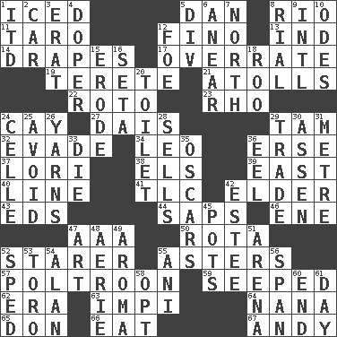 ACROSS 1. On the rocks 5. One of the 12 tribes of Israel 8. River (Sp.) 11. Pacific island yam 12. A pale, very dry sherry 13. Working for oneself (abbr.) 14. Window treatments 17. Make much ado about nothing 19. Cylindrical with tapered ends 21. Ringlike coral islands and reefs 22. Printing process, for short 23. 17th letter of the Greek alphabet 24. Island 27. Raised platform 29. Scottish cap 32. Elude 34. Lion 36. Celtic language 37. Australian parrot (variant) 38. Raised railways 39. Compass direction 40. Actor's bit 41. Affectionate concern, for short 42. A person who is older than you are 43. Begley and Asner 44. Plant excrements 46. Compass dir. 47. Auto club (abbr.) 50. Round or rotation of duties 52. A viewer who gazes fixedly 55. Michaelmas daisies 57. Characterized by complete cowardliness 59. Oozed 62. Period 63. Body of Kaffir warriors 64. Nanny 65. Spanish title 66. Erode 67. "60 Minutes" Commentator Rooney DOWN 1. It would 2. Automobile 3. Part of Q.E.F. 4. Drug addict 5. HTML Container Element 6. Approach 7. Compass direction 8. Monetary unit of Yemen 9. International (abbr.) 10. Lyric poems 12. Enemy 15. Wear away 16. Stalk of a moss capsule 18. Friend of Pooh 20. Bathroom plumbing fixture 24. Cell (Danish) 25. Stay clear from 26. Tall tales 28. Exchanges for money 29. Buy and sell 30. NE Netherlands city 31. Distance measurement (Brit.) 33. Expire 35. Motion picture awards 36. Snakelike fish 42. First name in cosmetics 45. Cooking vessels 47. Nonscientific branch of learning 48. Nest on high 49. Scent 51. Sports stadium 52. Drove too fast 53. "Corrida" creature 54. ____ Jay Lerner 55. Cuckoo 56. Connect, as a bridge 58. Elect 60. Conclude 61. 24 hours