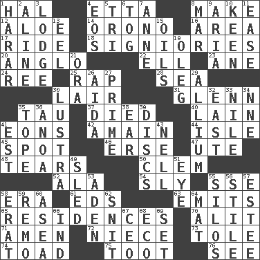 ACROSS 1. Actor Linden 4. Singer James 8. Cause to be 12. Medicinal plant 14. U. of Maine site 16. Type of rug 17. Travel on an animal 18. Seigniories (variant) 20. White American of non-Hispanic descent 22. Pipe bend 23. One (Scot) 24. To separate or throw off 25. Strike 28. Ocean 30. Den 31. American astronaut and politician John 35. The 19th letter of the Greek alphabet 37. Passed on 40. (Had) reclined 41. Immeasurably long periods of time 42. At full speed 44. Small island 45. Specific locale 46. Celtic language 47. Shoshoni 48. Pulls apart 50. Clement's nick name 52. In the manner of 54. Roguish 55. Compass dir. 58. Epoch 61. Begley and Asner 63. Sends forth 65. Dwellings 70. Came down and settled, as after flight 71. So be it 72. Sibling's daughter 73. Lacquered or enameled metalware 74. Frog relative 75. A blast of a horn 76. Observe DOWN 1. Ethiopian city, capital of Harari 2. Place in a line 3. Cabin 4. Greek goddess of the dawn 5. Three (prefix) 6. Coat; cloak 7. Queen of England 1702-14 8. Impair 9. Operatic vocal solo 10. Peachy ____! 11. Relaxation 13. Snakelike fish 15. Lubricates 19. Cassini of fashion 21. Mouth or opening 26. Opera by Verdi 27. A-one 29. Plant genus of onion and garlic 30. A period of five years 32. Compass direction 33. Mediterranean tributary 34. Compass dir. 35. Drink excessively 36. Small Philippine buffalo 38. Ewer handle 39. Plates 41. Eastern Standard Time (abbr.) 43. 1994 drama film starring Jodie Foster 49. Downhill vehicle 51. Sight organ 53. An important port of Yemen 55. Grain storage towers 56. Vertical member of a panel or frame 57. First name in cosmetics 58. Part of Q.E.F. 59. San ____ (Riviera town) 60. Toward the sea 62. In a ____ (agitated or irritated) 64. Floor protector 66. Indiana (abbr.) 67. Corporate head (abbr.) 68. Environmental prefix 69. Put into a specified state