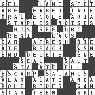 ACROSS 1. Set 4. Unable to walk 8. Proofreading order 12. "We ___ not amused" (Victoria) 13. Having ears or earlike features 14. Lie 15. Relating to the mouth 17. Learning spot: Fr. 18. Operatic vocal solo 19. Paper fasteners 21. Annoying sounds 23. Part of HMS, perhaps 24. Observe 26. RI univ. 27. Painter Guido (1575-1642) 28. Fails to keep up a pace 30. Hearing organ 31. Anew 34. Pass on 37. Compete 38. Arrive at 39. Compass dir. 40. Conclude 41. Erase 42. Compass dir. 43. Lick closed 44. Table seasoning 46. R.R. building 47. Had dinner 50. Pipe bend 51. Fortification 54. Deli grouping 57. Having or resembling wings 58. Having winglike extensions 60. Small Philippine buffalo 62. Hero or heavy, e.g. 63. Amusement-park features 64. Separate the seeds from cotton 65. Play the lead 66. Adolescent 67. _ Lanka DOWN 1. E Mali city 2. Blunders 3. Tough but pliablecoriaceous 4. Shoestrings 5. Came up 6. Cartoonist voice _ Blanc 7. Paradise 8. Flight of steps 9. Tarsus (plural) 10. Writer Wiesel 11. Beverages made from leaves 13. Snakelike fish 16. (Had) reclined 20. 23rd letter of the Greek alphabet 22. Ending for "Through" and "Enough" 25. Voters do this 27. Precipitation 29. American tennis player Robert 30. Night before a holiday 31. Type of rug 32. Man or boy (slang) 33. Actress Charlotte 34. Residences 35. Is not 36. She-sheep 41. Letter starter 43. A viewer who gazes fixedly 44. Ocean 45. _ mater 46. Any of the three canals of the cochlea 48. Sadhe (variant) 49. Consumed 51. Hearing organs 52. Position in a hierarchy or organization 53. Component 55. French article 56. Fly high 59. Untruth 61. Cuckoo