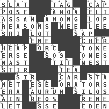 ACROSS 1. Narrow board 5. Label 8. Head covering 11. Airs 12. Small Philippine buffalo 14. Connecticut Ivy Leaguer 15. Indian state 17. Amid 18. Chop off 19. Thinks logically 21. Born 22. Area sheltered from the wind 23. Indian title of respect (Mr.) 24. Car dealer's back yard 25. Plant excrement 27. Compass dir. 28. "Mermaids" star 31. Pile 35. The grampus (Milton) 37. Casino tip 38. Celtic language 39. Distress signal 41. Washington bills 42. Political cartoonist Thomas 43. Teat (slang) 45. A home for chicks 46. Commotion 47. Afternoon social gathering 49. Title for a knight 51. Automobile 52. R.R. building 55. Soggy 57. Compass dir. 60. Speakers 62. Epoch 63. Gold (Symbol: Au) 65. Grain storage towers 66. The 18th letter of the Arabic alphabet 67. Vintage cars 68. French philosopher Descartes 69. Allow 70. Compass dir. 71. Paradise DOWN 1. Practice fights 2. Failure 3. Slender Brazilian palm 4. Afternoon social gatherings 5. Scottish cap 6. Soon (poet.) 7. Went 8. Portable communications device 9. Medicinal plant 10. Corncob 13. Eons 16. Undercover agent 17. Michaelmas daisies 20. Words to Nanette 26. NE Massachussets city 29. Makes supply last 30. Relief 31. Coop moms 32. Part of Q.E.F. 33. Aide 34. _ dish (used to culture cells) 36. Small bed 40. "Cheers" or "Ellen" 44. Pull apart 48. Ancient river in northeast Turkey 50. Stern 52. Having a sole or soles 53. Heavy duty weighing machine 54. NE Netherlands city 55. Welt 56. One of the Great Lakes 58. Institutes legal proceedings 59. Greek god of love 61. Become fatigued 64. Purpose