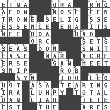 ACROSS 1. Inactive volcano in Sicily 5. Mouth or opening 8. 17th letter of the Greek alphabet 11. Age 12. Sense of smell 14. Car or cant ending 15. Marketplace scale 17. Major League Baseball Commissioner Bud 18. Compass dir. 19. Center 21. Period 22. ___ a Wonderful Life 23. Born 24. ___ good deed 25. Male parent 27. The grampus (Milton) 28. Arranges properly for use 31. Oceans 35. Spanish title 37. In a ____ (agitated or irritated) 38. Comfort 39. Armed conflict 41. Measure of real estate 42. Celtic language 43. Separate the seeds from cotton 45. Confront 46. Clip 47. Director Reiner 49. Symbol (abbr.) 51. Wedding promise 52. Lion 55. Being at a high temperature 57. White ___ sheet 60. Pulling into pieces 62. Retirement account (abbr.) 63. Containing lumps 65. "_____ Recall" 66. One of the 12 tribes of Israel 67. One who doesn't tell the truth 68. False hair 69. Eastern Standard Time (abbr.) 70. Definite Article 71. Ancient Greek god of war DOWN 1. Consumed 2. Laconic 3. Trap for birds or small mammals 4. Queen of England 1702-14 5. Single 6. Hero or heavy, e.g. 7. SW Saudi Arabia district 8. Home 9. Behest 10. Singles 13. Mild oath 16. Inside; within (prefix) 17. Manatee 20. Drawstring 26. Indian state 29. Become fatigued 30. Proofreading order 31. Observes 32. Merit 33. Helper 34. Oozy 36. Tired old horse 40. Noteworthy scarcity 44. Connecting point 48. Water vessel 50. Promenade 52. 61 cubic inches 53. Related on the mother's side 54. Stares at amorously 55. Flintstone garb 56. Mouths or openings 58. Set or collection 59. Wet nurse 61. Round or rotation of duties 64. Before (prefix)