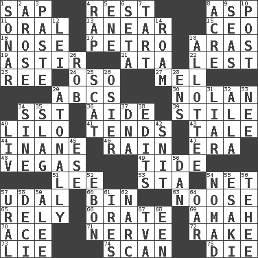 ACROSS 1. Plant excrement 4. Respite 8. Cleo's killer 11. Taken by mouth 13. Approach 15. Corporate head (abbr.) 16. Sense of smell 17. Stone: prefix 18. Ancient river in northeast Turkey 19. Moving or stirring 21. _ moment's notice (2 wds.) 22. For fear that 23. To riddle 24. Bear (Spanish) 27. Cartoonist voice _ Blanc 29. Lettered men learn these first 30. Pitcher Ryan 34. Fast jet (abbr.) 36. Assistant 39. Vertical member of a panel or frame 40. _ and Stitch 41. Is inclined (to) 43. Lie 44. Empty; void 46. Precipitation 47. Period 48. Viva Las _ 49. Event that recurs at intervals 51. Area sheltered from the wind 53. R.R. building 54. Fish or hair follower 57. Freehold land 60. Storage container 63. Trap for birds or small mammals 65. Trust 66. Speak pompously 69. Housemaid 70. Adept person 71. Effrontery 72. Libertine 73. Untruth 74. Glance over 75. Expire DOWN 1. Echolocation 2. Came up 3. Thick mixture 4. Hit sharply and swiftly 5. Compass dir. 6. Stalk of a moss capsule 7. Small pie 8. Land measure 9. Oceans 10. Mail 12. Flowery wreath 14. Wander aimlessly 18. One to whom something is allotted 20. Director Reiner 25. Scram! 26. Flexible twig of a willow tree 28. Followers of ems 29. Without tonality 31. One who doesn't tell the truth 32. Silent film actress Nazimova 33. Born 34. Trig term 35. Volcanic refuse 37. Heredity factor (abbr.) 38. Proofreads 40. 54 in ancient Rome 42. In a ____ (agitated or irritated) 45. Compass dir. 50. One of the 12 tribes of Israel 52. Inky black, to poets 54. Roamer 55. 1973 Nobel Price Winner (Physics) Leo 56. Giggle 57. Mountain range 58. Tenth: prefix 59. Toward shelter 61. Angers 62. Drug cop 64. Rowing implement 67. Federal power corp. 68. Car or cant ending