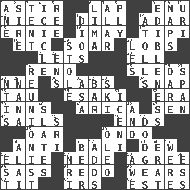 ACROSS 1. Moving or stirring 6. Infant locale 9. Australian flightless bird 12. Sibling's daughter 13. Deli pickle 14. The sixth month of the Jewish calendar 15. Bert's buddy 16. "If ____ say so..." 17. Native american tent (variation) 18. And so on (abbr.) 19. Fly high 20. Tennis shots 21. Allows 23. Pipe bend 24. Western Nevada city 25. Bobsleighs 28. Compass dir. 30. Broad, flat, thick pieces 34. Fastener 35. The 19th letter of the Greek alphabet 36. 1973 Nobel Price Winner (Physics) Leo 38. Epoch 39. Lodging establishments 41. N. Chile seaport 43. Elected rep. 44. Moves on water 46. Extremities 48. Rowing implement 49. Southwest Nigerian state 50. Against 51. Indonesian resort city 53. Morning condensation 56. Writer Wiesel 57. Ancient Persian 58. Match 60. Backtalk 61. Make new 62. Puts on (as clothing) 63. Teat (slang) 64. Big collection agency 65. _____ Park, CO DOWN 1. One (Scot) 2. Beget 3. Portable shelter 4. Hanging ice 5. Portuguese money of account (variant) 6. Pale green bean 7. Having or resembling wings 8. Strand of rope, yarn or thread 9. The property of being fit to eat 10. Atlas contents 11. RI univ. 13. "Vaya con ____" 14. Ringlike coral islands and reefs 19. Fur scarf 20. French article 22. Followers of ems 24. One who advocates reunion 26. Have the gumption 27. Connect, as a bridge 28. Nuclear Threat Initiatives 29. Grandmother 31. White ___ sheet 32. Tavern 33. What Jean-Claude Killy likes to do 37. Ancient Celtic tribe of eastern Britain 40. Chalkboards 42. Also 45. _ Lanka 47. Evades 49. Butter sub 50. Jai ____ 51. Fermented drink made from hops 52. Does sums 54. Part of Q.E.F. 55. We are 56. Eastern Standard Time (abbr.) 57. Medical imaging device (abbr.) 58. Deep reverence 59. Double-curved letter