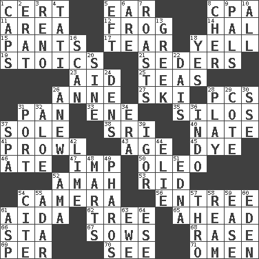 ACROSS 1. An absolute certainty 5. Ewer handle 8. Numbers guy (abbr.) 11. Length times width 12. Tree-dwelling hopper 14. Actor Linden 15. Leg coverings 17. Lacerate 18. Shout 19. Unemotional ones 21. Spring feasts 23. Help 25. Afternoon social gatherings 26. Singer Murray 27. What Jean-Claude Killy likes to do 28. Personal Computers (abbr.) 31. Baking dish 33. Compass dir. 35. Grain storage towers 37. Flatfish 38. _ Lanka 40. Nathan's nickname 41. Move like a hungry wolf 43. Personal question 45. Color 46. Had dinner 47. Naughty child 50. Butter sub 52. Housemaid 53. To free from 54. Device for capturing images 56. Main course 61. Opera by Verdi 62. Relationship diagram 65. At or in the front 66. R.R. building 67. Sty mamas 68. Raze (variant) 69. For each 70. Observe 71. Sign of something about to happen DOWN 1. Smile enhancers 2. Part of Q.E.F. 3. Former U.S. Attorney General Janet 4. Jacques of French films 5. Newt 6. "We ___ not amused" (Victoria) 7. Exposes to great heat 8. "Mermaids" star 9. Friends 10. Everything 13. Of Greece 16. Glance over 18. Affirmative reply 20. Trig term 22. Raised platform 24. Lairs 26. Afresh 28. Shaw product 29. ____ d'Azur (French Riviera) 30. Compass dir. 31. Left side of a ship or aircraft 32. Medicinal plant 34. Period 36. Southeast Asian peninsula 37. Health resort 39. Composer Stravinsky 42. Welles in "The Third Man" 44. Writer Wiesel 48. Shops 49. N Egypt peninsula 51. Pulitzer Prize-winning author Ferber 52. Housemaid (var.) 54. Quote 55. The sixth month of the Jewish calendar 57. Through, poetically 58. 480, 500 or 516 sheets of paper 59. Relaxation 60. Genesis locale 61. Viper 63. She-sheep 64. Compass dir.