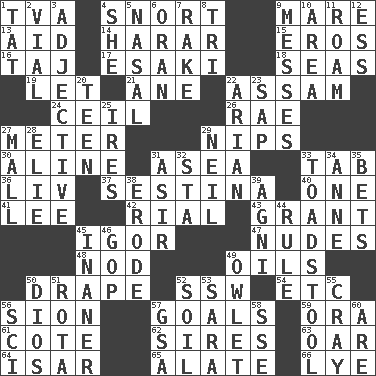ACROSS 1. Federal power corp. 4. Derisive sound 9. Female horse 13. Help 14. Ethiopian city, capital of Harari 15. Greek god of love 16. _ Mahal 17. 1973 Nobel Price Winner (Physics) Leo 18. Oceans 19. Allow 21. One (Scot) 22. Indian state 24. To provide with a ceiling 26. Actress Charlotte 27. Distance measurement 29. Pinches, bites 30. Place in a line 31. At sea 33. Keyboard key 36. 54 in ancient Rome 37. French poetic form 40. Single 41. Area sheltered from the wind 42. Monetary unit of Yemen 43. Let have 45. Composer Stravinsky 47. Unadorned figures 48. Dreamland 49. Lubricates 50. Window treatment 52. Compass dir. 54. And so on (abbr.) 56. The Jewish people; Israel 57. Finish lines 59. Mouth or opening 61. ____ d'Azur (French Riviera) 62. Begets 63. Rowing implement 64. Austrian river, tributary to the Danube 65. Having winglike extensions 66. Potassium hydroxide DOWN 1. Make lace 2. Small bottle 3. Descriptive word 4. A female animal or person 5. Rhinal 6. Northwest Algerian city 7. Immoral or dissolute person 8. Three (prefix) 9. Makes clutter 10. Type of rug 11. Wander aimlessly 12. Curvy letter 20. Adolescent 22. Believer in; advocate of (suffix) 23. Plant excrement 25. Angers 27. Shopping center 28. Writer Wiesel 29. Famous astronaut Armstrong 31. SW Saudi Arabia district 32. R.R. building 33. Inedible or poisonous agaric 34. Singer Murray 35. Wagers 38. Wear away 39. Hindu god of fire 44. Court order 45. Sillier 46. Grand Old Party 49. A small or young owl 50. "Vaya con ____" 51. Roll call or roster of names 52. Land 53. "Two Mules for Sister ____" 55. Supercomputer manufacturer 56. _-fi 57. Girls' org. (abbr.) 58. Compass dir. 60. "We ___ not amused" (Victoria)