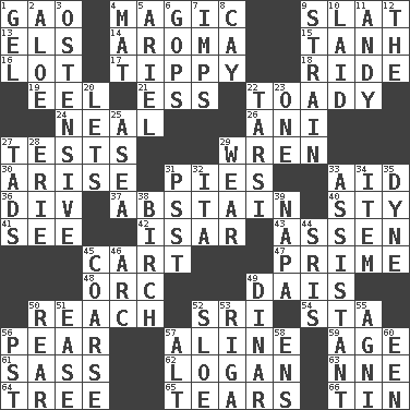 ACROSS 1. E Mali city 4. Mysterious quality of enchantment 9. Narrow board 13. Raised railways 14. Scent 15. Hyperbolic tangent 16. Car dealer's back yard 17. Likely to tip or tilt 18. Travel on an animal 19. Snakelike fish 21. Double-curved letter 22. Sycophant 24. Anneal 26. Cuckoo 27. Trials 29. Songbird 30. Get up 31. Sliced desserts 33. Assist 36. HTML Container Element 37. Choose not to consume 40. Filthy place 41. Perceive with the eye 42. Austrian river, tributary to the Danube 43. NE Netherlands city 45. Haul 47. A-one 48. The grampus (Milton) 49. Raised platform 50. Arrive at 52. _ Lanka 54. R.R. building 56. Lightbulb-shaped fruit 57. Place in a line 59. Personal question 61. Backtalk 62. Utah city north of Ogden 63. Compass dir. 64. Relationship diagram 65. Separates forcefully 66. Shallow baking pan DOWN 1. Set 2. _ vera 3. Clearly or manifestly demonstrative 4. Floor protector 5. Satellite of Uranus 6. Republicans 7. Naughty children 8. Island 9. Put through a sieve 10. Put down 11. "60 Minutes" Commentator Rooney 12. Definite Article 20. Allows 22. Tarsus (plural) 23. Single 25. Toward the sea 27. Small amounts or degrees 28. 4th largest of the Great Lakes 29. Put on (as clothing) 31. Inconspicuous attention getter 32. Call ___ day 33. Aide 34. Detail 35. Unit of force 38. A tree used for making furniture 39. California wine valley 44. Indian titles of respect 45. Unrefined 46. Curve 49. Middle Eastern gold or silver currency 50. Posterior 51. Relaxation 52. A type of plum 53. Capital of Latvia 55. Hindu god of fire 56. Pacific Standard Time (abbr.) 57. Keyboard modifier key 58. Followers of ems 60. Car or cant ending