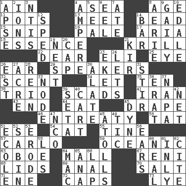 ACROSS 1. The 18th letter of the Arabic alphabet 4. Toward the sea 8. Mature 11. Plant holders 13. Confront 14. Necklace unit 15. Clip 16. Light colored 17. Roberta Peters solo 18. Center 21. Shrimp-like planktonic crustaceans 22. Letter starter 23. Biblical high priest 25. Sight organ 26. Hearing organ 29. Orators 32. Odor 34. Allow 35. "___ Little Indians" 38. Musical group of three 39. Loads 41. SW Asia republic 43. Conclusion 44. Consume 45. Window treatment 46. Plea 50. Make lace 51. Compass dir. 54. Domesticated feline 55. Prong on a fork 57. Monte _, Las Vegas Hotel/Casino 59. Pertaining to the sea 63. Mitch Miller's instrument 64. Promenade 67. Painter Guido (1575-1642) 68. Flaplike coverings 69. Of or related to the anus 70. Table seasoning 71. Compass dir. 72. Balmoral and tarboosh 73. Sodium hydroxide DOWN 1. Domed church section 2. Charged atoms 3. Nuclear Threat Initiatives 4. Electrical Unit 5. Ocean 6. Snakelike fish 7. Had dinner 8. Nest on high 9. Lightheartedly 10. Peak District village in England 12. Drove too fast 14. Drinking establishment 19. Egg locale 20. Head covering 21. Apertif with cassis 23. Made supply last 24. Allows 26. Eastern Standard Time (abbr.) 27. 1/640 square mile 28. It's straight from the horse's mouth 30. Having winglike extensions 31. Use a swizzle stick 33. Thickened enlargement 36. Part of Q.E.F. 37. California wine valley 39. Bristle 40. Draw slowly or heavily 42. Fish or hair follower 45. Centimeter-gram-second unit of force 47. Non-commissioned officer (abbr.) 48. Ringlike coral islands and reefs 49. Nervous spasm 51. Learning spot: Fr. 52. Unit of acoustic absorption 53. Eat (away) 56. Hearing organs 58. French article 60. Actress Patricia 61. Inwardly 62. Quote 64. Big _ 65. Santa ___, CA 66. Infant locale