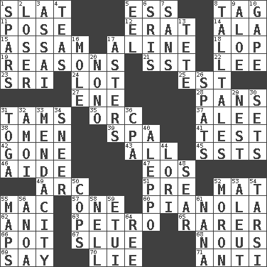ACROSS 1. Narrow board 5. Curvy letter 8. Label 11. Airs 12. Part of Q.E.F. 14. Insect wing 15. Indian state 17. Place in a line 18. Chop off 19. Thinks logically 21. Fast jet (abbr.) 22. Area sheltered from the wind 23. _ Lanka 24. Car dealer's back yard 25. Eastern Standard Time (abbr.) 27. Compass dir. 28. Zero-star reviews 31. Scottish caps 35. The grampus (Milton) 37. Toward shelter 38. Sign of something about to happen 39. Health resort 41. Trial 42. Went 43. 100% 45. Fast planes 46. Helper 47. Greek goddess of the dawn 49. Curve 51. Before (prefix) 52. Floor covering 55. Apple computer (short form) 57. Single 60. Player piano 62. Black tropical American cuckoo 63. Stone: prefix 65. More uncommon 66. Cooking vessel 67. Change direction abruptly 68. Common sense 69. Declare 70. Whopper 71. Opposed to DOWN 1. Practice fights 2. Failure 3. Slender Brazilian palm 4. Afternoon social gatherings 5. Snakelike fish 6. Indian titles of respect 7. Without 8. Baron Munchausen's specialties 9. _ vera 10. Open wide 13. Wig 16. Undercover agent 17. Michaelmas daisies 20. Words to Nanette 26. Arguments over trivial matters 29. Egg locale 30. Arranges properly for use 31. Ancient Roman robe 32. Mine, in Marseilles 33. Ananias' fault 34. Contemptuous expression 36. Tax preparer (abbr.) 40. City in Syria 44. Australian parrot (variant) 48. Singe 50. 911 reaches them 52. Person of subnormal intelligence 53. Native American of Southwest Alaska 54. Tarsus (plural) 55. Atlas contents 56. Small Philippine buffalo 58. 1994 drama film starring Jodie Foster 59. Needle holder 61. Grandmother 64. To sift