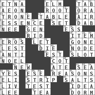 ACROSS 1. Inactive volcano in Sicily 5. Shade tree 8. Keyboard key 11. Period of immesurable duration 12. Carrot, for example 14. Mouth or opening 15. Heavy duty weighing machine 17. Eating place 18. Wind 19. Core 21. Arrange properly for use 22. Apply (a substance) by light strokes 23. Born 24. Commissioned mil. rank 25. Curvy letter 27. To free from 28. A whole individual unit 31. Greek god of love 35. Allow 37. Went 38. For fear that 39. Pass on 41. Connecting point 42. Opposed to 43. Eastern Standard Time (abbr.) 45. Narrow opening 46. Christmas carol 47. Small bed 49. ___ Haven, CT 51. Had dinner 52. Ocean 55. It is so 57. Compass dir. 60. Thinks logically 62. Biblical high priest 63. Remove all contents or possession from 65. Table seasonings 66. 54 in ancient Rome 67. Trial 68. The content of cognition 69. Area sheltered from the wind 70. Beverage made from leaves 71. Dormintory (informal) DOWN 1. Ingested 2. Laconic 3. Trap for birds or small mammals 4. Queen of England 1702-14 5. Epoch 6. Tennis shots 7. Undercover agent 8. Inedible or poisonous agaric 9. Roberta Peters solo 10. Sharp remark 13. False hair 16. Engineer (abbr.) 17. Watched over 20. To provide with a ceiling 26. Public displays of written messages 29. Inside; within (prefix) 30. Rendezvous 31. Liveliness 32. Western Nevada city 33. Clearly or manifestly demonstrative 34. Vertical member of a panel or frame 36. Standoff 40. Fortification 44. Haul 48. Beverages made from leaves 50. Compass direction 52. Twentieth part of a lira 53. Keyboard key 54. Indian state 55. Shout 56. Writer Wiesel 58. Proofreading order 59. Celtic language 61. Expressed in words 64. Call ___ day