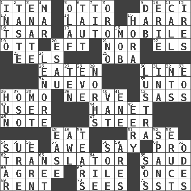 ACROSS 1. Detail 5. "Beetle Bailey" pooch 9. Tenth: prefix 13. Nanny 14. Den 15. Ethiopian city, capital of Harari 16. Russian ruler of old 17. Car 19. Baseball player Mel 20. Lizard (obsolete) 21. Not either 22. Raised railways 23. Snakelike fish 25. Chief or king in Benin or Nigeria 26. Eroded 30. Welles in "The Third Man" 34. New (sp.) 35. To (old English) 36. Same (prefix) 39. Effrontery 42. Backtalk 43. One who uses or employs something 44. French painter Edouard 46. Observe 47. Navigate 48. Consume 51. To erase 54. Take to court 57. Deep reverence 58. Declare 60. Adept person 62. Interpreter 65. Saudi Arabian king (1953-1964) 66. Match 67. Cause heat under the collar 68. Single time 69. Monthly bill 70. Perceives with the eye 71. Fast planes DOWN 1. To the inside or interior of 2. Clothes sense 3. Maternal 4. Make imperfect 5. Norwegian king 6. Pulled tight 7. Teat (slang) 8. U. of Maine site 9. Apply (a substance) by light strokes 10. One of the Great Lakes 11. Give a ring to 12. Angers 15. Israeli folk dance 18. Disorderly crowd 20. Son of Isaac 24. Poe poem 27. "___ Little Indians" 28. Night before a holiday 29. Typical models 30. A period of five years 31. _ tizzy (2 wds.) 32. Mountains (abbr.) 33. Greek goddess of the dawn 36. Attila the _ 37. Bear (Spanish) 38. Was introduced to 40. Large container 41. Compass dir. 45. Suggestive of the supernatural 48. Relaxation 49. Leather borer 50. Lacerates 52. Connects, as a bridge 53. Spew [out] 54. Play the lead 55. Goad 56. Merit 58. Not divided or shared with others 59. Ancient Greek god of war 61. Lyric poems 63. Fish or hair follower 64. Standoff 65. Mayday