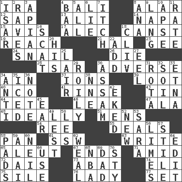 ACROSS 1. Retirement account (abbr.) 4. Indonesian resort city 8. Having or resembling wings 12. Plant excrement 13. Came down and settled, as after flight 14. California wine valley 15. Deliberation 17. Actor Baldwin 18. 2nd pers. sing. pres. of can (arch.) 19. Arrive at 21. Actor Linden 23. Unit of force equal to gravity 24. Slow-paced one 26. Pass on 28. Russian ruler of old 30. Contrary to your interests or welfare 34. The 18th letter of the Arabic alphabet 37. Charged particles 39. Spoils 40. Non-commissioned officer (abbr.) 41. Wash lightly 43. Metal container 44. Wig 46. Path through which fluid escapes 47. Insect wing 48. Under perfect conditions 51. Not women's 54. To riddle 55. Allots cards 58. Baking dish 61. Compass dir. 63. Compose 65. Native American of Southwest Alaska 67. Extremities 71. Among 72. Raised platform 73. Blind as ____ 74. Biblical high priest 75. Filth; sediment 76. Kenny Rogers chart-topper in '80 77. Put into a specified state DOWN 1. Austrian river, tributary to the Danube 2. All-night dance parties 3. Bee-related 4. Sound made by sheep 5. 100% 6. Whopper 7. Hankering 8. Santa ___, CA 9. Austrian-born American filmmaker Fritz 10. Domed church section 11. Assign a rank or rating to 16. Scram, to a cat 18. 154 in Roman numerals 20. Part of HMS, perhaps 22. Increase 25. Den 27. Snakelike fish 29. Turbulent 30. Indian state 31. Roll call or roster of names 32. Earth 33. Inactive volcano in Sicily 34. Opposed to 35. On the rocks 36. Observe 38. Compass dir. 42. Made supply last 45. Ewer handle 49. For fear that 50. French article 52. ___ Haven, CT 53. "Two Mules for Sister ____" 56. Citrus fruits 57. Vertical member of a panel or frame 58. Writing tablets 59. Jai ____ 60. Famous astronaut Armstrong 62. Welt 64. Prepare for publication 66. Purpose 68. Basketball assoc. 69. June honoree 70. Filthy place