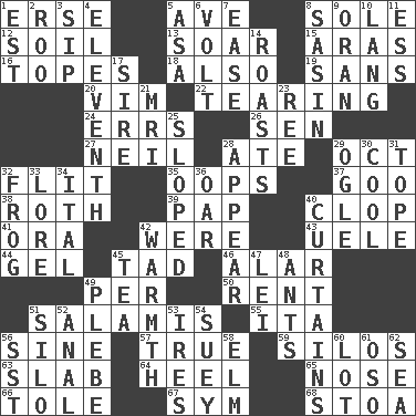 ACROSS 1. Celtic language 5. "___ Maria" 8. Not divided or shared with others 12. Earth 13. Fly high 15. Caspian sea tributary 16. Drinks excessively 18. In addition 19. Without 20. Zeal 22. Separating forcefully 24. Blunders 26. Elected rep. 27. Famous astronaut Armstrong 28. Had dinner 29. Sep. follower 32. Sudden quick movement 35. I made a mistake 37. Thick or sticky substance 38. Writer of Portnoy's Complaint (1969) 39. Infant food 40. Hoof sound 41. Mouth or opening 42. Past tense of be (plural) 43. Ubangi River tributary 44. Set 45. Bit 46. Having or resembling wings 49. For each 50. Monthly bill 51. Deli grouping 55. Call ___ day 56. Trig term 57. Loyal 59. Grain storage towers 63. Thick slice 64. The bottom of a shoe or boot 65. Olfactory organ 66. Lacquered or enameled metalware 67. Symbol (abbr.) 68. Portico DOWN 1. Eastern Standard Time (abbr.) 2. Friend of Pooh 3. Small drink 4. Veterans Day date 5. White ___ sheet 6. Electrical Unit 7. Relaxation 8. Indian antelope 9. NW Algerian seaport 10. Long (Scottish) 11. Double-curved letter 14. Cooks with dry heat, as in an oven 17. Title for a man of rank and authority 21. Medical imaging device (abbr.) 23. To sift 25. Inclined 28. Seem 29. Stare 30. Calm and collected 31. Drink excessively 32. Tree-dwelling hopper 33. Old wives' tales, e.g. 34. Slanted text style (abbr.) 36. Boat paddle 40. Window treatments 42. Heat 45. Beverage made from leaves 47. Luau accessory 48. Pismires 49. Cadet 51. Grain storage tower 52. Of or related to the anus 53. Angers 54. Chop _ 56. Fast jet (abbr.) 58. Shade tree 60. Car dealer's back yard 61. Bear (Spanish) 62. Ocean