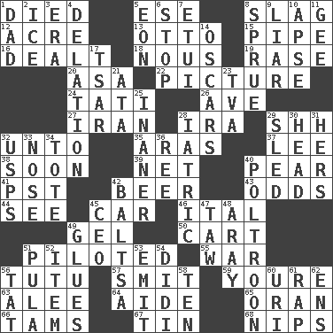 ACROSS 1. Passed on 5. Compass dir. 8. Volcanic refuse 12. Land measure 13. Von Bismarck 15. Corncob 16. Started a card game 18. Common sense 19. To erase 20. White ___ sheet 22. Photo 24. Jacques of French films 26. "___ Maria" 27. SW Asia republic 28. Lyricist Gershwin 29. Quiet! 32. To (old English) 35. Ancient river in northeast Turkey 37. Area sheltered from the wind 38. Within a short period 39. Fish or hair follower 40. Lightbulb-shaped fruit 41. Pacific Standard Time (abbr.) 42. Fermented drink made from hops 43. Probability 44. Perceive with the eye 45. 4-wheeled motor vehicle 46. Slanted text style (abbr.) 49. Set 50. Haul 51. Manned the helm 55. Armed conflict 56. Ballerina skirt 57. Stricken, poetically 59. You are 63. Toward shelter 64. Helper 65. Northwest Algerian city 66. Scottish caps 67. Metal container 68. Pinches, bites DOWN 1. June honoree 2. Frozen water 3. Epoch 4. Conveyance 5. Age 6. Close up, plug up 7. Needle holder 8. Upset 9. One who doesn't tell the truth 10. Domed church section 11. Unit of force equal to gravity 14. Motion picture awards 17. Russian ruler of old 21. _ moment's notice (2 wds.) 23. Federal power corp. 25. Sillier 28. Of or pertaining to medicine 29. Downhill vehicle 30. Froth on beer 31. Possessive pronoun 32. United States Postal Service (abbr.) 33. Olfactory organ 34. Carryall 36. To riddle 40. Coward 42. Greek mezzo-soprano Agnes 45. Corporate head (abbr.) 47. The 23rd letter of the Hebrew alphabet 48. Like ___ of sunshine 49. Cements 51. Monetary unit of Botswana 52. Detail 53. Send forth 54. "You Light Up My Life" star Conn 56. Make lace 58. Nine, plus one 60. RI univ. 61. Hit sharply and swiftly 62. Followers of ems