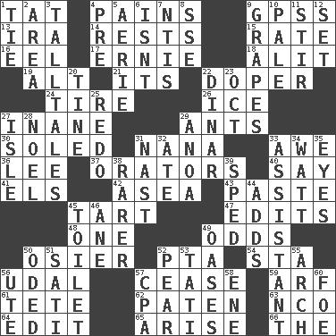 ACROSS 1. Make lace 4. Aches 9. Global Positioning Systems (abbr.) 13. Lyricist Gershwin 14. Musical pauses 15. Assign a rank or rating to 16. Snakelike fish 17. Bert's buddy 18. Set down 19. Keyboard modifier key 21. It is 22. Drug addict 24. Hoop that covers a wheel 26. Frozen water 27. Lacking in sense or substance 29. Pismires 30. Having a sole or soles 31. Grandmother 33. Deep reverence 36. Area sheltered from the wind 37. Speakers 40. Declare 41. Raised railways 42. At sea 43. Thick mixture 45. Small pie 47. Proofreads 48. Single 49. Probability 50. Flexible twig of a willow tree 52. Parent Teacher Association (abbr.) 54. R.R. building 56. Hereditary estate 57. Stop 59. Sandy's bark 61. False hair 62. Eucharist need 63. Non-commissioned officer (abbr.) 64. Prepare for publication 65. Originate 66. Definite Article DOWN 1. Make a knot 2. Length times width 3. Baron Munchausen's specialties 4. Before (prefix) 5. Nest on high 6. Is not 7. Nuclear Threat Initiatives 8. Compass dir. 9. Raisin fruits 10. Light colored 11. Use a swizzle stick 12. Put into a specified state 20. Prong on a fork 22. Middle Eastern gold or silver currency 23. Sep. follower 25. Do over again 27. Capri or Wright 28. Christmas carol 29. Small Philippine buffalo 31. Political cartoonist Thomas 32. Had dinner 33. Helper 34. Electrical Unit 35. Snake ____ (dice throw) 38. Less widely known 39. Moved rapidly 44. Does sums 45. Bathroom 46. One (Scot) 49. Fertile tracts in a desert 50. Wrote a lyric poem 51. Suttee (variant) 52. Lightbulb-shaped fruit 53. Jacques of French films 55. Bowlike part 56. Shoshoni 57. Tax preparer (abbr.) 58. Compass dir. 60. Enemy