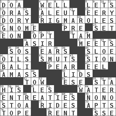 ACROSS 1. ___ good deed 4. Water source 8. Allows 12. Mouths or openings 14. Eskimo relative 16. Suggestive of the supernatural 17. Rowboat 18. Frustrating wastes of time 20. Dwarf 22. Before (prefix) 23. Arrange properly for use 24. Age 25. Choose 28. Scottish cap 30. SW Saudi Arabia district 31. Confronts 35. Mayday 37. Hearing organs 40. A type of plum 41. Lubricates 42. Particles of soot 44. The Jewish people; Israel 45. Indonesian resort city 46. Lightbulb-shaped fruit 47. Snakelike fish 48. Collect or gather 50. Flaplike coverings 52. Pull behind 54. Compass dir. 55. R.R. building 58. Part of HMS, perhaps 61. French article 63. Wetness 65. Pleas 70. Words to Nanette 71. Portico 72. Amusement-park features 73. Flats, for short 74. Drink excessively 75. Monthly bill 76. Compass dir. DOWN 1. Evade 2. U. of Maine site 3. Composer Copland 4. Armed conflict 5. Connecticut Ivy Leaguer 6. Part of a journey 7. Mass 8. Lion 9. Snakelike fish 10. Relationship diagram 11. System (abbr.) 13. Symbol (abbr.) 15. Small pie 19. 480, 500 or 516 sheets of paper 21. Greek goddess of the dawn 26. Sliced desserts 27. _____ steamer (cargo ship) 29. Makes clutter 30. Aid 32. Writer Wiesel 33. Implement 34. Elected rep. 35. Thailand, formerly 36. Rounded earthenware pot or jar 38. Regret 39. Lacking originality or spontaneity 41. Chief or king in Benin or Nigeria 43. Indian titles of respect 49. Flatfish 51. Morning condensation 53. Erode 55. Ceases 56. Portable shelters 57. Came up 58. Behest 59. To the inside or interior of 60. Close up, plug up 62. Commotion 64. Santa ___, CA 66. Actress Charlotte 67. Binary compound 68. Car or cant ending 69. Fast jet (abbr.)