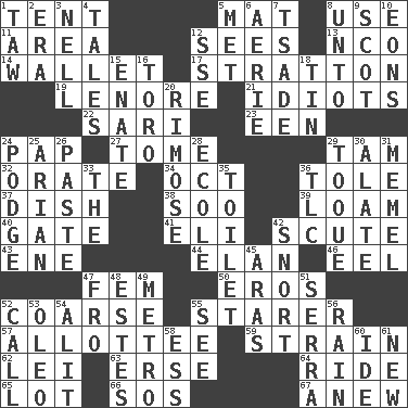ACROSS 1. Portable shelter 5. Floor protector 8. Purpose 11. Length times width 12. Observes 13. Non-commissioned officer (abbr.) 14. Place for singles 17. Ski resort town in Vermont 19. Poe poem 21. Foolish or stupid persons 22. Indian skirt 23. Car or cant ending 24. Infant food 27. Heavy book 29. Scottish cap 32. Speak pompously 34. Sep. follower 36. Lacquered or enameled metalware 37. Food container 38. "Barney Miller" actor Jack 39. Rich soil 40. Yard entry 41. Connecticut Ivy Leaguer 42. Turtle shell scale 43. Compass dir. 44. Flair 46. Snakelike fish 47. Opposite of masc. 50. Greek god of love 52. Rough 55. A viewer who gazes fixedly 57. One to whom something is allotted 59. Put through a sieve 62. Flowery wreath 63. Celtic language 64. Travel on or in a vehicle 65. Car dealer's back yard 66. Distress signal 67. Afresh DOWN 1. The 23rd letter of the Hebrew alphabet 2. Period 3. 1994 drama film starring Jodie Foster 4. Falsehoods 5. Was introduced to 6. Nest on high 7. Sadhe (variant) 8. To (old English) 9. Highlander 10. Immeasurably long periods of time 12. Compass dir. 15. Maternal 16. "Corrida" creature 18. Shallow baking pan 20. Full of chinks, cracks, or crevices 24. Porridge 25. Believer in; advocate of (suffix) 26. Thick mixture 28. Learning spot: Fr. 29. Woman's close-fitting hat 30. Having winglike extensions 31. Klaipeda city 33. Definite Article 35. Rest room 36. Affectionate concern, for short 42. Derisive sound 45. Caspian sea tributary 47. From 48. _____ Park, CO 49. Paris' subway 51. Father Junipero _ 52. Give a ring to 53. Margarine 54. Set down 55. Perceive with the eye 56. Water falling in drops from the sky 58. Double-curved letter 60. Binary compound 61. ___ Haven, CT