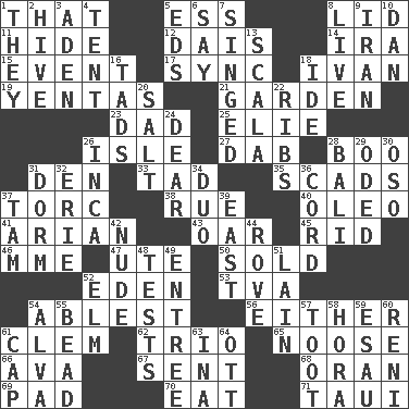 ACROSS 1. Not this but _ 5. Curvy letter 8. Hat (slang) 11. Flintstone garb 12. Raised platform 14. Retirement account (abbr.) 15. Incident 17. Synchronize (abbr.) 18. _ the terrible 19. Gossips 21. Place where plants grow 23. Male parent 25. Writer Wiesel 26. Capri or Wright 27. Pat or tap gently 28. Surprise greeting 31. Lair 33. Bit 35. Large numbers or amounts 37. Torque (variant) 38. Regret 40. Butter sub 41. Believer in; advocate of (suffix) 43. Rowing implement 45. To free from 46. Madame (abbr.) 47. Shoshoni 50. Disposed of to a purchaser 52. Paradise 53. Federal power corp. 54. Most capable 56. One or the other of two 61. Clement's nick name 62. Musical group of three 65. Trap for birds or small mammals 66. Actress Gardner 67. Emitted 68. NW Algerian seaport 69. Groovy apt. 70. Erode 71. "Change" in Tahitian DOWN 1. Those things 2. Hub of activity 3. Arabian gulf 4. Portable shelter 5. Begley and Asner 6. Declare 7. Scorched 8. Not recorded 9. SW Asia republic 10. Daniel's nick name 13. Any of the three canals of the cochlea 16. Small amounts or degrees 18. Binary compound 20. Table seasoning 22. Teases 24. Letter starter 26. South American Indian 28. Indonesian resort city 29. Wrote a lyric poem 30. Bear (Spanish) 31. Dormintory (informal) 32. One of the Great Lakes 34. Superhero pair 36. Drawstring 37. Scottish cap 39. Compass direction 42. Unadorned 44. Be footloose 48. Trials 49. Main course 51. (Had) reclined 52. Shade tree 54. Inventor's middle name 55. Necklace unit 57. A blast of a horn 58. Israeli folk dance 59. Son of Isaac 60. Painter Guido (1575-1642) 61. Head covering 63. _ tizzy (2 wds.) 64. Baseball player Mel