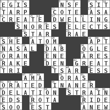 ACROSS 1. Armor plate that protects the chest 5. Overdraft (abbr.) 8. Be seated 11. Canvas cover 12. ____ d'Azur (French Riviera) 13. White ___ sheet 14. Make 17. Home 19. Sounds asleep 21. Opts 22. Play the lead 23. Actress Charlotte 24. A female animal or person 27. Smallest unit of an element 29. Fitting 32. Rhinal 34. Small moist lump or mass 36. Stare at amorously 37. Northwest Algerian city 38. Compass dir. 39. Ancient Greek god of war 40. Immoral or dissolute person 41. Lair 42. Relatively large 43. Three (prefix) 44. Russian ruler of old 46. Curvy letter 47. Nursemaid (var.) 50. Mouths or openings 52. Spoke pompously 55. More lacking in sense or substance 57. Accusation by an informer 59. Put through a sieve 62. Begley and Asner 63. Roll call or roster of names 64. Travel on or in a vehicle 65. "Barney Miller" actor Jack 66. Eastern Standard Time (abbr.) 67. Afresh DOWN 1. And so on (abbr.) 2. Slender fish 3. Angers 4. Connects, as a bridge 5. Immediately 6. Guide 7. Chap (slang) 8. Ketch in the Levant 9. Is not 10. Labels 12. Music discs 15. Add up to 16. Part of Q.E.F. 18. Area sheltered from the wind 20. Worn away 24. Derisive sound 25. Ethiopian city, capital of Harari 26. 1973 Nobel Price Winner (Physics) Leo 28. French painter Edouard 29. Match 30. Entreaties 31. Trials 33. A saturated hydrocarbon 35. Gillaume's butler role 36. Rowing implement 42. Let have 45. Caspian sea tributary 47. "One Day ___ Time" 48. Distance measurement (Brit.) 49. Goodbye (Sp.) 51. Spanish missionary in California 52. Lyric poems 53. Make new 54. In addition 55. _ tizzy (2 wds.) 56. Precipitation 58. Baseball player Mel 60. Binary compound 61. ___ Haven, CT