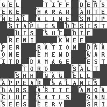 ACROSS 1. Set 4. Small quarrel 8. Lairs 12. Supplement with great effort 13. Ethiopian city, capital of Harari 14. Johnson of "Laugh-In" 15. Be tempered by heat 17. Place in a line 18. Clip 19. Paper fasteners 21. Cease 23. Part of HMS, perhaps 24. A female animal or person 26. Expire 27. Painter Guido (1575-1642) 28. Leg joint 30. For each 31. Food allowance for one day 34. Heredity factor (abbr.) 37. Single 38. Make improvements or corrections to 39. Armed conflict 40. It would 41. Break 42. Eastern Standard Time (abbr.) 43. "Corrida" creature 44. Table seasoning 46. Quiet! 47. Tired old horse 50. Pipe bend 51. Seem 54. Deli grouping 57. Taverns 58. Nick name for Arthur 60. Small Philippine buffalo 62. A slight indication 63. Travel by water 64. Separate the seeds from cotton 65. Perceives with the eye 66. Suggestive of the supernatural 67. Indian title of respect (Mr.) DOWN 1. Commissioned mil. rank 2. Supplements with great effort 3. Resembling or made to resemble leather 4. Stories 5. From or relating to Ireland 6. Air blower 7. Flintstone 8. Hyrax 9. Bert's buddy 10. Nuclear Threat Initiatives 11. Back-to-school mo. 13. Actor Linden 16. (Had) reclined 20. Air pressure measure (abbr.) 22. Locale of original sin 25. Supplementing with great effort 27. Monthly bill 29. Connecting point 30. Luau course 31. Buttocks 32. ID or VA city 33. Beverage made from leaves 34. Homes 35. Political cartoonist Thomas 36. Nonscientific branch of learning 41. Capital of the state of Qatar 43. College papers 44. Ocean 45. _ mater 46. Upset 48. Moving or stirring 49. Lightheartedly 51. Lettered men learn these first 52. Diluted with white 53. To erase 55. French article 56. Fly high 59. Actress Charlotte 61. Black tropical American cuckoo
