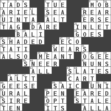 ACROSS 1. Small amounts or degrees 5. Third day of the wk. 8. Crowd into 11. Satellite of Uranus 13. Ocean 14. Rump 15. National forest in Provo, Utah 16. Keyboard modifier key 17. Celtic language 18. Label 19. Have the gumption 21. An arm off of a larger body of water 22. Indonesian resort city 24. Leaves 25. Cast a shadow over 27. Environmental prefix 29. Jacques of French films 30. Puts on (as clothing) 32. In addition 33. Intended 35. Double curve, resembling the letter S 39. Scornful expression 41. Religious women 42. 100% 43. Chalkboards 45. Set down 48. Haul 49. Honkers 50. Ketch in the Levant 52. Single; one (prefix) 55. Mountain range 56. Fenced enclosure 57. Having ears or earlike features 59. Male parent of an animal 60. Choose 61. Having lost freshness 62. Nine, plus one 63. It is 64. Silent film actress Nazimova DOWN 1. Drawn tight 2. Operatic vocal solo 3. Empty-headed or silly people 4. Arrange properly for use 5. Russian ruler of old 6. Ubangi River tributary 7. Ingest 8. Haggard of country music 9. Fertile tracts in a desert 10. Cy Young winner Saberhagen 12. Dipping utensil 14. Western Nevada city 20. Assist 21. Composer Stravinsky 23. Goodbye (Sp.) 25. R.R. building 26. Actor Linden 27. Car or cant ending 28. Domesticated feline 30. Armed conflict 31. Underwater navigation system 33. Cartoonist voice _ Blanc 34. Snakelike fish 36. From the throat 37. Compass dir. 38. Double-curved letter 40. Nathan's nickname 43. _-fi 44. Shoestrings 45. Nest on high 46. Acquire or gain knowledge or skills 47. Capri or Wright 49. Abrupt rush of wind 50. Back-to-school mo. 51. Pismires 53. 1994 drama film starring Jodie Foster 54. The content of cognition 56. Luau course 58. _ moment's notice (2 wds.)