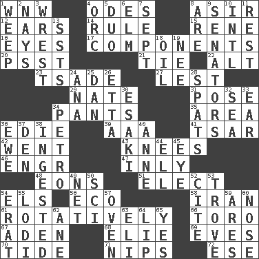 ACROSS 1. Compass dir. 4. Lyric poems 8. SW Saudi Arabia district 12. Hearing organs 14. General guideline 15. French philosopher Descartes 16. Snake ____ (dice throw) 17. Parts 20. Inconspicuous attention getter 21. Neckwear 22. Keyboard modifier key 23. Sadhe (variant) 27. For fear that 29. Nathan's nickname 31. Introduce or present, as a question 34. Leg coverings 35. Length times width 36. Singer Brickell 39. American Automobile Association (abbr.) 41. Russian ruler of old 42. Gone 43. Leg joints 46. Engineer (abbr.) 47. In an inward manner 48. Immeasurably long periods of time 51. Choose 54. Raised railways 56. Environmental prefix 58. SW Asia republic 61. Happening in regular succession 66. "Corrida" creature 67. An important port of Yemen 68. Writer Wiesel 69. Nights before holidays 70. Periodic rise and fall of the sea level 71. Pinches, bites 72. Compass dir. DOWN 1. Shed a tear 2. Negative votes 3. Obtain by seizing forcibly or violently 4. The grampus (Milton) 5. Superhero pair 6. Shade tree 7. Back-to-school mo. 8. "We ___ not amused" (Victoria) 9. Elected representatives 10. International (abbr.) 11. State of inaction 13. Fast planes 18. Lubricate 19. Born 24. Santa ___, CA 25. One of the 12 tribes of Israel 26. Singer James 28. Arguments over trivial matters 30. 1973 Nobel Price Winner (Physics) Leo 32. Ocean 33. Hearing organ 34. Stone: prefix 36. She-sheep 37. Lair 38. Eaten 40. Queen of England 1702-14 44. Pipe bend 45. Sight organ 49. Fish or hair follower 50. _-fi 52. Quote 53. Collection of objects 54. Part of Q.E.F. 55. Farming town in central California 57. Baking chamber 59. Ancient Greek god of war 60. Olfactory organ 62. One (Scot) 63. Connecticut Ivy Leaguer 64. Mouth edge 65. Consenting reply
