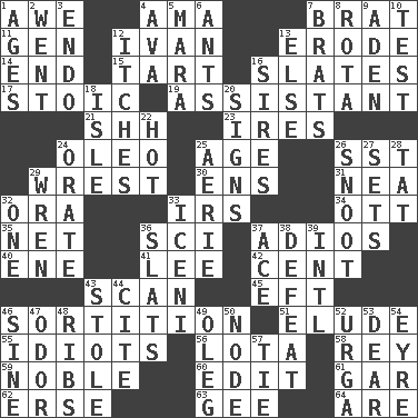 ACROSS 1. Deep reverence 4. Nursemaid (var.) 7. Naughty child 11. Commissioned military rank (abbr.) 12. _ the terrible 13. Wear away 14. Conclusion 15. Small pie 16. Chalkboards 17. Unemotional 19. Aide 21. Quiet! 23. Angers 24. Butter sub 25. Grow older 26. Fast jet (abbr.) 29. Obtain by seizing forcibly or violently 30. Followers of ems 31. Teachers' org. 32. Mouth or opening 33. Big collection agency 34. Baseball player Mel 35. Fish or hair follower 36. _-fi 37. Goodbye (Sp.) 40. Compass dir. 41. Area sheltered from the wind 42. Penny 43. Skim 45. Newt 46. Conclusion 51. Dodge 55. Foolish or stupid persons 56. Globular water bottle used in Asia 58. Marina Del _, California 59. Impressive in appearance 60. Prepare for publication 61. Slender fish 62. Celtic language 63. Unit of force equal to gravity 64. "We ___ not amused" (Victoria) DOWN 1. Grows older 2. Gone 3. Inside; within (prefix) 4. Actress Gardner 5. Hindu Mythology: god of death 6. Pismires 7. Naughty children 8. Round or rotation of duties 9. An important port of Yemen 10. Trial 12. Strong, restless desires 13. Otherwise 16. Male parents of animals 18. Capri or Wright 20. Public displays of written messages 22. Being at a high temperature 24. Speak pompously 25. Nest on high 26. Snob 27. Arranges properly for use 28. Make lace 29. Songbird 32. Single 33. Ancient Celtic tribe of eastern Britain 36. Narrow boards 37. Adept person 38. Outscore 39. International (abbr.) 43. Took without asking 44. Quote 46. Trig term 47. Aroma 48. Chest bones 49. Cassini of fashion 50. Connecting point 52. Capital and largest city of Mongolia 53. Letter starter 54. Jane of fiction 57. Neckwear