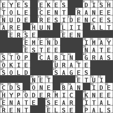 ACROSS 1. Snake ____ (dice throw) 5. Makes supply last 9. Food container 13. Lacquered or enameled metalware 14. Penny 15. Indian princess (variant) 16. Unadorned 17. Homes 19. "We ___ not amused" (Victoria) 20. Attila the _ 21. Cards in a Roman deck? 22. Keyboard modifier key 23. Celtic language 25. Car or cant ending 26. Make improvements or corrections to 30. "If ____ say so..." 34. First name in cosmetics 35. Nathan's nickname 36. Halt 39. Small house or cottage 42. Pate de foie ____ 43. Migrant worker of the '30s 44. A salt of uric acid 46. Exchanged or delivered for money 47. Gurus 48. Fish or hair follower 51. Needle holder 54. Music discs 57. Single 58. Prohibit 60. Binary compound 62. Below the epidermis 65. Leg joint 66. Related on the mother's side 67. Wither 68. Slanted text style (abbr.) 69. Monthly bill 70. Otherwise 71. Friends DOWN 1. Inactive volcano in Sicily 2. You are 3. A person who is older than you are 4. Perceive with the eye 5. Shade of tan 6. Peachy ____! 7. Followers of ems 8. Vertical member of a panel or frame 9. Daniel's nick name 10. South American Indian 11. Sew up the eyelids of hawks and falcons 12. Behest 15. It's straight from the horse's mouth 18. Pass on 20. Is hesitant and indecisive 24. Oozed 27. And so on (abbr.) 28. Teachers' org. 29. To get out of a bus 30. Consume 31. Impair 32. _ moment's notice (2 wds.) 33. Consenting reply 36. Distress signal 37. Ring climax 38. Lubricate 40. Retirement account (abbr.) 41. Tired old horse 45. Adolescent 48. Connecting point 49. Compass dir. 50. Laconic 52. National forest in Provo, Utah 53. Perfect 54. "Mermaids" star 55. Centimeter-gram-second unit of force 56. Connect, as a bridge 58. Prejudice 59. Land measure 61. Snakelike fish 63. Baseball player Mel 64. Cartoonist voice _ Blanc 65. Sleep