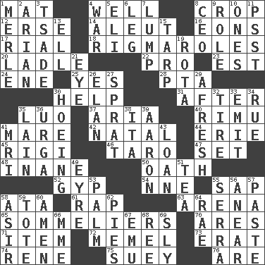ACROSS 1. Floor covering 4. Not ill 8. Riding implement 12. Celtic language 14. Eskimo relative 16. Immeasurably long periods of time 17. Monetary unit of Yemen 18. Frustrating wastes of time 20. Dipping utensil 22. Adept person 23. Eastern Standard Time (abbr.) 24. Compass dir. 25. It is so 28. Parent Teacher Association (abbr.) 30. Assist 31. Following 35. Nilotic language 37. Roberta Peters solo 40. Tall New Zealand timber tree 41. Female horse 42. Relating to or accompanying birth 44. One of the Great Lakes 45. Swiss mountan, "Queen of the Mountains" 46. Edible starchy tuberous root 47. Arrange properly for use 48. Silly 50. Pledge 52. Con 54. Compass dir. 55. Plant excrement 58. _ moment's notice (2 wds.) 61. Reproach for some lapse or misdeed 63. Sports stadium 65. Wine waiters 70. Ancient Greek god of war 71. A distinct part 72. Klaipeda city 73. Part of Q.E.F. 74. French philosopher Descartes 75. Chop _ 76. "We ___ not amused" (Victoria) DOWN 1. Haggard of country music 2. Believer in; advocate of (suffix) 3. Sadhe (variant) 4. Armed conflict 5. Connecticut Ivy Leaguer 6. Part of a journey 7. Mass 8. Corporate head (abbr.) 9. Hero or heavy, e.g. 10. Singles 11. Inconspicuous attention getter 13. Pipe bend 15. Canvas cover 19. Roll call or roster of names 21. Sight organ 26. Liveliness 27. Small fatty European fish 29. Anew 30. Cultivating 32. Hoop that covers a wheel 33. Give off 34. Regret 35. (Had) reclined 36. Capital and largest city of Mongolia 38. Call ___ day 39. Composer Copland 41. Medical imaging device (abbr.) 43. Grant temporary use of 49. Jane of fiction 51. Afternoon social gathering 53. Inside of hand 55. Father Junipero _ 56. Approach 57. Thick mixture 58. SW Saudi Arabia district 59. Lug 60. So be it 62. Sliced desserts 64. Actress Charlotte 66. Madame (abbr.) 67. Australian flightless bird 68. To sift 69. Stealthy