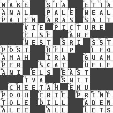 ACROSS 1. Create 5. R.R. building 8. Singer James 12. Of or related to the anus 13. Light colored 15. Be tempered by heat 16. Eucharist need 18. Ancient river in northeast Turkey 19. Table seasoning 20. Compete 22. Photo 24. Otherwise 26. "We ___ not amused" (Victoria) 27. A home for chicks 28. Indian title of respect (Mr.) 29. Fast jet (abbr.) 32. Mail 35. Assist 37. Lion 38. Wet nurse 39. Lyricist Gershwin 40. Island territory of the United States 41. For each 42. Scram, to a cat 43. Ubangi River tributary 44. Black tropical American cuckoo 45. Raised railways 46. 90 degrees 49. Federal power corp. 50. In a ____ (agitated or irritated) 51. Leopard's kin 55. Australian flightless bird 56. "Silly old bear" 57. One of the Great Lakes 59. A-one 63. Lacquered or enameled metalware 64. Deli pickle 65. An important port of Yemen 66. Toward shelter 67. Everything 68. Allows DOWN 1. Atlas unit 2. Santa ___, CA 3. Krazy ___ of comics 4. Veterans Day date 5. Health resort 6. Canvas cover 7. Jai ____ 8. Take place subsequently 9. Pull into pieces 10. Lie 11. Keyboard modifier key 14. Fortification 17. The longest river in the world 21. Double-curved letter 23. Three (prefix) 25. Moral principles 28. Chalkboards 29. Turn sharply 30. Lick closed 31. Heavy book 32. Dad 33. Presage 34. Indian skirt 36. Epoch 40. From the throat 42. Scheduled 45. First lady 47. A saturated hydrocarbon 48. Simple or foolish person 49. Giggle 51. Calm and collected 52. Opening into or through something 53. Roberta Peters solo 54. Land elevation 56. Parent Teacher Assoc. 58. Pipe bend 60. Binary compound 61. Was introduced to 62. Followers of ems