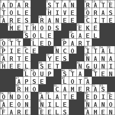 ACROSS 1. The sixth month of the Jewish calendar 5. Comedian Laurel of Laurel & Hardy 9. Assign a rank or rating to 13. Lacquered or enameled metalware 14. Hub of activity 15. Mouths or openings 16. Ancient Greek god of war 17. The wife of a rajah (variant) 18. Quote 19. Modes 21. Supplement with great effort 22. Flatfish 23. Highlander 24. Baseball player Mel 27. Directed 28. Role in a play 29. Part 31. Non-commissioned officer (abbr.) 32. Slanted text style (abbr.) 36. Johnson of "Laugh-In" 37. Affirmative reply 38. Nanny 39. Person who is morally reprehensible 40. Put into a specified state 41. Group of southern Bantu languages 42. Central Nebraska county 44. R.R. building 46. Nine, plus one 47. Domed church section 48. Globular water bottle used in Asia 50. 17th letter of the Greek alphabet 51. Devices for capturing images 54. Southwest Nigerian state 56. Having winglike extensions 58. Singer Brickell 60. A really long time 61. "Death on the ____" 62. Billionth: prefix 63. Conductor's collection 64. Snakelike fish 65. So be it DOWN 1. _ moment's notice (2 wds.) 2. Dormintory (informal) 3. Toward shelter 4. Musical pauses 5. Cast a shadow over 6. Metal containers 7. "___ Maria" 8. Born 9. Shooting up abruptly 10. Satellite of Uranus 11. Make lace 12. Compass dir. 17. Hero or heavy, e.g. 20. Hollow 21. Ewer handle 23. E Mali city 24. Brightly colored fish 25. Become fatigued 26. False hair 28. Personal Computers (abbr.) 30. Portable communications device 31. Fish or hair follower 33. Strained 34. Singer Murray 35. (Had) reclined 37. Slangy assent 40. Institute legal proceedings 41. Nathan's nickname 43. Bear (Spanish) 44. Chalkboards 45. Heavy book 47. Zeal 49. Sports stadium 51. Give a ring to 52. First man 53. Trig term 54. Clumsy lout 55. Teachers' org. 56. A saturated hydrocarbon 57. Whopper 59. Age