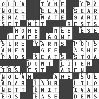 ACROSS 1. Water jar 5. Not wild 9. Accounting whiz (abbr.) 12. Christmas carol 13. Style 14. Wither 15. Part of Q.E.F. 16. Nathan's nickname 17. Indian skirt 18. Arrange properly for use 19. Was introduced to 21. Musical pauses 22. Residence 24. Born 26. Compass dir. 27. Prying instrument 28. Went 29. Male parent of an animal 30. Tall tales 32. Cooking vessels 36. So be it 37. Turn to the right 38. American tennis player Robert 39. Groovy apts. 40. Theater features 42. Portico 43. Do not 44. 61 cubic inches 46. Big collection agency 49. Eastern Standard Time (abbr.) 50. Arabian gulf 51. Pitcher Ryan 53. Deep reverence 54. Take to court 57. The sixth month of the Jewish calendar 58. Cowardly lion portrayer 61. _ and Stitch 62. Remaining after all deductions 63. Send forth 64. "Terrible" tsar 65. Greek goddess of the dawn 66. Relaxation 67. Hiding places for outlaws DOWN 1. Washington bills 2. Old wives' tales, e.g. 3. Tough but pliablecoriaceous 4. The first octave above the treble staff 5. Portable shelter 6. Chicken ___ king 7. Floor covering 8. Compass dir. 9. Stop 10. Pieces 11. Originate 14. Compass dir. 19. Madame (abbr.) 20. Suggestive of the supernatural 21. To riddle 23. Baking chambers 24. Music written for nine 25. Followers of ems 27. Pale green bean 28. Relatively large 29. Plant excrement 31. Representative 32. Thick mixture 33. Clearly or manifestly demonstrative 34. Son of Odin 35. Ocean 40. Mayday 41. Cole _ (cabbage dish) 43. Lair 45. Binary compound 46. Silly 47. Cowboy competition 48. Narrow boards 52. Tate display 53. Johnson of "Laugh-In" 55. ____ Bator 56. Immeasurably long periods of time 58. Area sheltered from the wind 59. Nanny (var.) 60. Part of HMS, perhaps 61. Hat (slang)