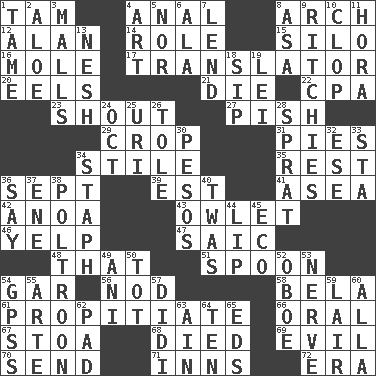 ACROSS 1. Scottish cap 4. Of or related to the anus 8. Bowlike part 12. ____ Jay Lerner 14. Hero or heavy, e.g. 15. Grain storage tower 16. Undercover agent 17. Interpreter 20. Snakelike fish 21. Expire 22. Accounting whiz (abbr.) 23. Yell 27. Expression of disdain 29. Riding implement 31. Sliced desserts 34. Vertical member of a panel or frame 35. Take ten 36. Back-to-school mo. 39. Eastern Standard Time (abbr.) 41. At sea 42. Small Philippine buffalo 43. A small or young owl 46. Sharp bark 47. Ketch in the Levant 48. Not this but _ 51. Soup utensil 54. Slender fish 56. Dreamland 58. Actor Lugosi 61. Appease 66. Taken by mouth 67. Portico 68. Passed on 69. Morally bad or wrong 70. Transmit 71. Restaurants 72. Period DOWN 1. Docile 2. _ vera 3. Shopping centers 4. Nonscientific branch of learning 5. Not either 6. In the manner of 7. Grant temporary use of 8. White ___ sheet 9. Actors Guy, Robert Welles, and Clint 10. Hoof sound 11. Israeli folk dance 13. Delicate 18. Small drink 19. Flowery wreath 24. Sep. follower 25. RI univ. 26. Lacquered or enameled metalware 28. Small fatty European fish 30. Mexican monetary units 32. Compass dir. 33. R.R. building 34. Staphylococcus 36. Declare 37. Compass dir. 38. Characterized by complete cowardliness 40. It was, poetically 44. Mouth edge 45. Environmental prefix 49. Cuckoo 50. Small child 52. Mitch Miller's instrument 53. Effrontery 54. Global Positioning Systems (abbr.) 55. Johnson of "Laugh-In" 57. "You Light Up My Life" star Conn 59. Den 60. Silent film actress Nazimova 62. Writing tablet 63. The 18th letter of the Arabic alphabet 64. Nine, plus one 65. Begley and Asner