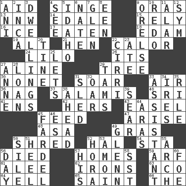 ACROSS 1. Assist 4. Burn superficially 9. Mouths or openings 13. Compass dir. 14. Peak District village in England 15. Have confidence or faith in 16. Frozen water 17. Consumed 18. Dutch treat 19. Keyboard modifier key 21. Layer 22. Bodily heat indicating an inflammation 24. _ and Stitch 26. ___ a Wonderful Life 27. Place in a line 29. Woody plant 30. Music written for nine 31. Fly high 33. Wind 36. Tired old horse 37. Deli grouping 40. _ Lanka 41. Followers of ems 42. Possessive pronoun 43. Artist's stand 45. Nourish 47. Ascend 48. White ___ sheet 49. Pate de foie ____ 50. Fragment 52. Actor Linden 54. R.R. building 56. Passed on 57. Dwellings 59. Sandy's bark 61. Toward shelter 62. Removes the wrinkles 63. Non-commissioned officer (abbr.) 64. Shout 65. Virtuous person 66. Definite Article DOWN 1. Cuckoo 2. South American Indian 3. Residences 4. Perceive with the eye 5. Potato state 6. Nathan's nickname 7. Small, secluded valley 8. Car or cant ending 9. Threatening words 10. Redecorate 11. Having or resembling wings 12. Symbol (abbr.) 20. Prong on a fork 22. High-altitude cloud 23. Had dinner 25. Allows 27. Queen of England 1702-14 28. Grant temporary use of 29. Scottish caps 31. Downhill vehicle 32. Rowing implement 33. Helper 34. Angers 35. Cause heat under the collar 38. Forward in time 39. Scorch 44. Ancient river in northeast Turkey 45. Pack 46. Compass dir. 49. American astronaut and politician John 50. Filth; sediment 51. The bottom of a shoe or boot 52. Israeli folk dance 53. Mine, in Marseilles 55. Bowlike part 56. 24 hours 57. Part of HMS, perhaps 58. Fast jet (abbr.) 60. Enemy
