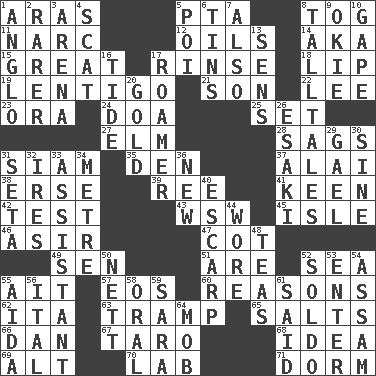 ACROSS 1. Ancient river in northeast Turkey 5. Parent Teacher Association (abbr.) 8. Coat; cloak 11. Drug cop 12. Lubricates 14. Alias (abbr.) 15. Relatively large 17. Remove soap 18. Mouth edge 19. Small, flat, pigmented spot on the skin 21. Manchild 22. Area sheltered from the wind 23. Mouth or opening 24. ___ good deed 25. Arrange properly for use 27. Shade tree 28. Sinks 31. Thailand, formerly 35. Lair 37. Mountain range southwest of Kyrgyzstan 38. Celtic language 39. To riddle 41. Peachy ____! 42. Trial 43. Compass dir. 45. Capri or Wright 46. SW Saudi Arabia district 47. Small bed 49. Elected rep. 51. "We ___ not amused" (Victoria) 52. Ocean 55. Small island 57. Greek goddess of the dawn 60. Thinks logically 62. Call ___ day 63. _____ steamer (cargo ship) 65. Table seasonings 66. One of the 12 tribes of Israel 67. Edible starchy tuberous root 68. It may be bright or harebrained 69. Keyboard modifier key 70. Experiment locale 71. Dormintory (informal) DOWN 1. White American of non-Hispanic descent 2. More valued for its uncommonness 3. Sports stadium 4. Leave at once 5. Luau course 6. Metal containers 7. In addition 8. Baron Munchausen's specialties 9. Migrant worker of the '30s 10. Yawn 13. Elected reps. 16. Event that recurs at intervals 17. Nomad 20. Gilt 26. 1973 Nobel Price Winner (Physics) Leo 29. Highlander 30. Trig term 31. Bristle 32. Angers 33. Aide 34. Distance measurement (Brit.) 36. ___ Haven, CT 40. Fortification 44. Had on 48. Afternoon social gatherings 50. Remaining after all deductions 52. Twentieth part of a lira 53. Keyboard key 54. Indian state 55. Opera by Verdi 56. Slanted text style (abbr.) 58. Spoken 59. "Two Mules for Sister ____" 61. Stated 64. Disorderly crowd