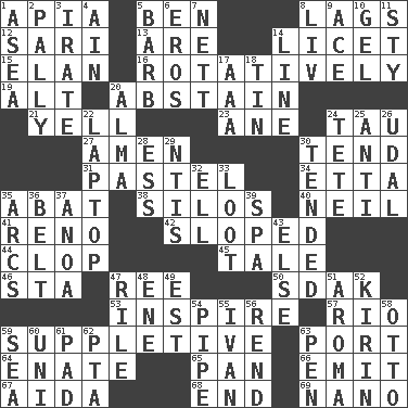 ACROSS 1. Capital of Western Samoa 5. Benjamin's nick name 8. Straggles 12. Indian skirt 13. "We ___ not amused" (Victoria) 14. It is permitted: Lat. 15. Enthusiasm 16. Happening in regular succession 19. The first octave above the treble staff 20. Refrain by choice 21. Shout 23. A saturated hydrocarbon 24. The 19th letter of the Greek alphabet 27. So be it 30. Be inclined (to) 31. Soft color 34. Singer James 35. Blind as ____ 38. Grain storage towers 40. Famous astronaut Armstrong 41. Former U.S. Attorney General Janet 42. Slanted 44. Hoof sound 45. Falsehood 46. R.R. building 47. To separate or throw off 50. Neighbor of Neb. 53. Stimulate to action 57. River (Sp.) 59. Supplementary 63. Sweet dark-red dessert wine 64. Related on the mother's side 65. Baking dish 66. Send forth 67. Opera by Verdi 68. Conclude 69. Billionth: prefix DOWN 1. Toward the sea 2. Chummy 3. Feeling or showing extreme anger 4. The 18th letter of the Arabic alphabet 5. Sharp remark 6. Greek god of love 7. Remaining after all deductions 8. 54 in ancient Rome 9. Adept person 10. Set 11. Filthy place 14. Actor's bit 17. American Automobile Association (abbr.) 18. Metal container 20. _ mater 22. Portable computer 24. Wig 25. Against 26. Hereditary estate 28. Double-curved letter 29. Nuclear Threat Initiatives 30. Watched over 32. Pipe bend 33. Spoils 35. Arches 36. Waist strap 37. Small Philippine buffalo 39. Health resort 43. Otherwise 47. Cause heat under the collar 48. Compass dir. 49. Eastern Standard Time (abbr.) 51. Odor 52. Japanese brewing company 54. Corncob 55. _ the terrible 56. Tear apart 58. Von Bismarck 59. Ocean 60. University (slang) 61. Writing tablet 62. Parent Teacher Association (abbr.) 63. Animal enclosure
