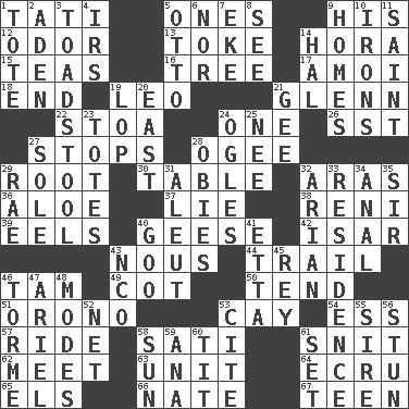 ACROSS 1. Jacques of French films 5. Washington bills 9. Part of HMS, perhaps 12. Scent 13. Casino tip 14. Israeli folk dance 15. Afternoon social gatherings 16. Family _ (genealogy) 17. Mine, in Marseilles 18. Conclude 19. Lion 21. American astronaut and politician John 22. Portico 24. Single 26. Fast jet (abbr.) 27. Halts 28. Double curve, resembling the letter S 29. Carrot, for example 30. Eating place 32. Ancient river in northeast Turkey 36. _ vera 37. Whopper 38. Painter Guido (1575-1642) 39. Snakelike fish 40. Honkers 42. Austrian river, tributary to the Danube 43. Common sense 44. Drop behind 46. Scottish cap 49. Small bed 50. Look after 51. U. of Maine site 53. Island 54. Curvy letter 57. Travel on or in a vehicle 58. Suttee (variant) 61. In a ____ (agitated or irritated) 62. Confront 63. A single undivided whole 64. Shade of tan 65. Raised railways 66. Nathan's nickname 67. Adolescent DOWN 1. Haul 2. An important port of Yemen 3. Inedible or poisonous agaric 4. Big collection agency 5. "Beetle Bailey" pooch 6. Or not 7. Supplement with great effort 8. Observe 9. Dwellings 10. Removes the wrinkles 11. Virtuous person 14. Actor Linden 19. Trim (branches) 20. 90 degrees 21. Turn to the right 23. Lugs 24. Stares at amorously 25. Born 27. Flatfish 28. Off-Broadway awards 29. Actress Charlotte 31. Eskimo relative 32. Believer in; advocate of (suffix) 33. Home 34. Of or related to the anus 35. Title for a knight 40. Thick or sticky substance 41. Singer James 43. Non-commissioned officer (abbr.) 45. Marina Del _, California 46. Singer Mel 47. Satellite of Uranus 48. Methods 52. Fish or hair follower 53. Quote 55. Father 56. Surprise greatly 58. Player for Phoenix 59. Santa ___, CA 60. Teat (slang) 61. Put into a specified state