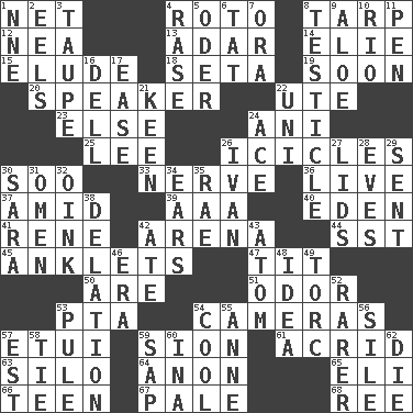 ACROSS 1. Fish or hair follower 4. Printing process, for short 8. Canvas cover 12. Teachers' org. 13. The sixth month of the Jewish calendar 14. Writer Wiesel 15. Evade 18. Stalk of a moss capsule 19. Within a short period 20. Orator 22. Shoshoni 23. Otherwise 24. Black tropical American cuckoo 25. Area sheltered from the wind 26. Winter's stalactites 30. "Barney Miller" actor Jack 33. Effrontery 36. Moving, as bait 37. Among 39. American Automobile Association (abbr.) 40. Paradise 41. French philosopher Descartes 42. Sports stadium 44. Fast jet (abbr.) 45. Short socks 47. Teat (slang) 50. "We ___ not amused" (Victoria) 51. Scent 53. Parent Teacher Assoc. 54. Devices for capturing images 57. Needle holder 59. The Jewish people; Israel 61. Bitter 63. Grain storage tower 64. Soon (poet.) 65. Biblical high priest 66. Adolescent 67. Light colored 68. To separate or throw off DOWN 1. Compass dir. 2. Snakelike fish 3. Grayish beige 4. Raze (variant) 5. Baltic tributary 6. Make lace 7. Mouth or opening 8. One of the two male reproductive glands 9. _ vera 10. River (Sp.) 11. Writing instrument 16. Small valley 17. Comfort 21. Peachy ____! 22. University (slang) 24. Adept person 26. "Terrible" tsar 27. Hats (slang) 28. Nights before holidays 29. Transmitted 30. "Two Mules for Sister ____" 31. Sign of something about to happen 32. Pig sound 34. Hearing organs 35. Actress Charlotte 38. Accusation by an informer 42. Had dinner 43. Tiny particle 46. Epoch 48. The main thing one is thinking about 49. Torque (variant) 52. More uncommon 53. Whimper 54. Calm and collected 55. Singer Murray 56. Drop; flow; fall 57. Eastern Standard Time (abbr.) 58. Make a knot 59. Plant excrement 60. _ tizzy (2 wds.) 62. Pass on