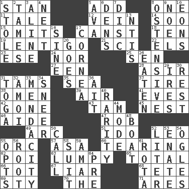 ACROSS 1. Comedian Laurel of Laurel & Hardy 5. Find the sum of 8. Single 11. Story 12. Distinctive style or manner 14. "Barney Miller" actor Jack 15. Leaves out 17. 2nd pers. sing. pres. of can (arch.) 18. "___ Little Indians" 19. Small, flat, pigmented spot on the skin 21. _-fi 22. Raised railways 23. Compass dir. 24. And not 25. Elected rep. 27. Car or cant ending 28. SW Saudi Arabia district 31. Scottish caps 35. Ocean 37. Hoop that covers a wheel 38. Presage 39. Wind 41. Nights before holidays 42. Went 43. Scottish cap 45. A home for chicks 46. Helper 47. Director Reiner 49. Curve 51. Wedding promise 52. Lion 55. The grampus (Milton) 57. White ___ sheet 60. Lacerating 62. Luau course 63. Containing lumps 65. Add up to 66. Small child 67. One who doesn't tell the truth 68. Wig 69. Filthy place 70. Definite Article 71. Ancient Greek god of war DOWN 1. Took without asking 2. Softens 3. Place in a line 4. Remaining after all deductions 5. Actress Gardner 6. Habitations of wild animals 7. Compact _ 8. Clearly or manifestly demonstrative 9. Christmas carol 10. Immeasurably long periods of time 13. Nuclear Threat Initiatives 16. Trig term 17. Pupil covering 20. Leaves 26. Eroded 29. Angers 30. Repose 31. Ancient Roman robe 32. Mine, in Marseilles 33. Ananias' fault 34. Contemptuous expression 36. Small island 40. Noteworthy scarcity 44. Method 48. Water vessel 50. Give a ring to 52. 61 cubic inches 53. Maternal 54. Stares 55. Elects 56. Carrot, for example 58. Costume for a special activity 59. Nanny 61. Round or rotation of duties 64. Before (prefix)