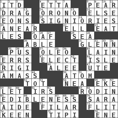 ACROSS 1. It would 4. Singer James 8. Lightbulb-shaped fruit 12. To draw with force 14. U. of Maine site 16. Otherwise 17. Immeasurably long periods of time 18. Seigniories (variant) 20. Approach 22. Pipe bend 23. Consume 24. French article 25. Clumsy lout 28. Ocean 30. Competent 31. American astronaut and politician John 35. Suppuration 37. Margarine 40. (Had) reclined 41. Blunders 42. Choose 44. Small island 45. Swiss mountan, "Queen of the Mountains" 46. Toward shelter 47. Shoshoni 48. Collect or gather 50. Tiny particle 52. Small child 54. Teachers' org. 55. Supplement with great effort 58. Allow 61. Big collection agency 63. "The Thinker" sculptor 65. The property of being fit to eat 70. "Two Mules for Sister ____" 71. Helper 72. Of or pertaining to a thread or threads 73. Secret move to avoid paying debts 74. Peachy ____! 75. Native american tent (variation) 76. Compass dir. DOWN 1. Perfect 2. Marketplace scale 3. Natives or inhabitants of Denmark 4. Greek goddess of the dawn 5. Three (prefix) 6. Coat; cloak 7. Singer Murray 8. For each 9. Writer Wiesel 10. At sea 11. Remainder 13. Girls' org. (abbr.) 15. Lubricates 19. Cassini of fashion 21. Director Reiner 26. Medicinal plant 27. Chap (slang) 29. Plant genus of onion and garlic 30. Help 32. 90 degrees 33. "Death on the ____" 34. Compass dir. 35. Demure 36. Capital and largest city of Mongolia 38. Snakelike fish 39. Sea 41. Period 43. False hair 49. Land 51. Rowing implement 53. Not kosher 55. Peak District village in England 56. Japanese brewing company 57. Maternal 58. Path through which fluid escapes 59. Singer Brickell 60. Periodic rise and fall of the sea level 62. In a ____ (agitated or irritated) 64. Order of Saint Francis (abbr.) 66. Benjamin's nick name 67. Biblical high priest 68. Plant excrement 69. Indian title of respect (Mr.)