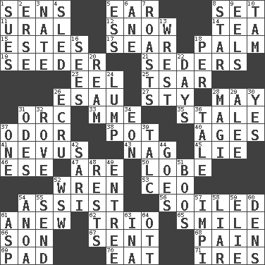 ACROSS 1. Elected reps. 5. Ewer handle 8. Put into a specified state 11. Mountain range 12. Frozen precipitation 14. Afternoon social gathering 15. _____ Park, CO 17. Shrivel 18. Inside of hand 19. Sowing specialist 21. Spring feasts 23. Snakelike fish 25. Russian ruler of old 26. Son of Isaac 27. Filthy place 28. Can I? 31. The grampus (Milton) 33. Madame (abbr.) 35. Showing deterioration from age 37. Aroma 38. Plant holder 40. Ripens 41. Mole, birthmark 43. Tired old horse 45. Untruth 46. Compass dir. 47. "We ___ not amused" (Victoria) 50. Ear part 52. Songbird 53. Corporate head (abbr.) 54. Help 56. Dirtied 61. Afresh 62. Musical group of three 65. Grin 66. Manchild 67. Emitted 68. Ache 69. Writing tablet 70. Consume 71. Angers DOWN 1. Institutes legal proceedings 2. Celtic language 3. Nathan's nickname 4. Downhill vehicle 5. Double-curved letter 6. A saturated hydrocarbon 7. Ridicules or criticizes harshly 8. Play the lead 9. Snakelike fish 10. Scottish cap 13. Take or capture by force 16. Observes 18. For each 20. 480, 500 or 516 sheets of paper 22. 24-hour periods 24. Mass 26. Shade of tan 28. Wise men 29. Toward shelter 30. Consenting reply 31. Lyric poems 32. Be footloose 34. Age 36. Story 37. Single 39. Baby powder 42. Indian skirt 44. Moves 48. Musical pauses 49. Main course 51. Scornful sounds 52. Compass dir. 54. Small Philippine buffalo 55. Transmit 57. Body of Kaffir warriors 58. One who doesn't tell the truth 59. Writer Wiesel 60. Lairs 61. Viper 63. _ tizzy (2 wds.) 64. Baseball player Mel