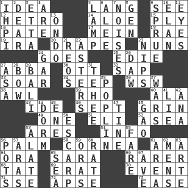 ACROSS 1. It may be bright or harebrained 5. Austrian-born American filmmaker Fritz 9. Perceive with the eye 12. Paris' subway 14. _ vera 15. Strand of rope, yarn or thread 16. Eucharist need 17. Chow _ 18. Actress Charlotte 19. Lyricist Gershwin 20. Window treatments 23. Religious women 24. Travels 25. Singer Brickell 27. Swedish rock group 30. Baseball player Mel 32. Plant excrement 33. Fly high 34. Ooze 36. Compass dir. 38. Leather borer 39. 17th letter of the Greek alphabet 40. In the manner of 43. Binary compound 46. Back-to-school mo. 48. Amused look 49. Single 51. Connecticut Ivy Leaguer 52. At sea 53. Ancient Greek god of war 54. Information 56. Inside of hand 58. Pupil covering 61. Nursemaid (var.) 64. Mouth or opening 65. "Two Mules for Sister ____" 66. Less widely known 68. Make lace 69. Part of Q.E.F. 70. Happening 71. Compass dir. 72. Domed church section 73. Relaxation DOWN 1. Body of Kaffir warriors 2. Letter starter 3. Singer James 4. "We ___ not amused" (Victoria) 5. Desk light 6. Toward shelter 7. Annoying sounds 8. Commissioned mil. rank 9. Disorder 10. Liveliness 11. Snake ____ (dice throw) 13. Southwest Nigerian state 21. Vintage cars 22. Michaelmas daisies 23. Cuts off 24. Slender fish 26. Simpleton 27. White ___ sheet 28. Ribbon knot 29. Indonesian resort city 31. Giggle 35. Cotton for raincoats, e.g. 37. Armed conflicts 41. Falsehood 42. Santa ___, CA 44. Dormintory (informal) 45. Compass dir. 47. Prong on a fork 48. E Mali city 50. Fortification 53. Having winglike extensions 55. Conductor's collection 56. Cooking vessels 57. Caspian sea tributary 59. Mouths or openings 60. Pace 61. Length times width 62. Not women's 63. Johnson of "Laugh-In" 65. Ocean 67. "___ Maria"