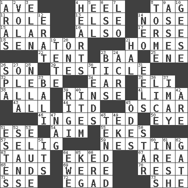 ACROSS 1. "___ Maria" 4. The bottom of a shoe or boot 8. Label 11. Hero or heavy, e.g. 13. Otherwise 14. Olfactory organ 15. Having or resembling wings 16. In addition 17. Celtic language 18. Legislator 21. Dwellings 22. Portable shelter 23. Sound made by sheep 25. Compass dir. 26. Boy, to dad 29. One of the two male reproductive glands 32. Military trainee 34. Ewer handle 35. Connecticut Ivy Leaguer 38. Silent film actress Nazimova 39. Remove soap 41. Pale green bean 43. 100% 44. It would 45. Motion picture award 46. Eaten 50. Sight organ 51. Compass dir. 54. Direct toward a target or goal 55. Supplements with great effort 57. Major League Baseball Commissioner Bud 59. Snuggling 63. Strained 64. Supplemented with great effort 67. Length times width 68. Conclusions 69. Past tense of be (plural) 70. Remainder 71. Compass dir. 72. Mild oath 73. A female animal or person DOWN 1. Ancient river in northeast Turkey 2. Grand slam 3. Enthusiasm 4. Centers 5. Pipe bend 6. Double-curved letter 7. Lion 8. Singer Mel 9. NE Netherlands city 10. Honkers 12. Part of Q.E.F. 14. Modern: prefix 19. False hair 20. Single 21. Actor Linden 23. Prejudice 24. Measure of real estate 26. Health resort 27. Rounded earthenware pot or jar 28. 1994 drama film starring Jodie Foster 30. Is inclined (to) 31. Snakelike fish 33. Indonesian resort city 36. Louse (plural) 37. "If ____ say so..." 39. Swiss mountan, "Queen of the Mountains" 40. A distinct part 42. "We ___ not amused" (Victoria) 45. Lyric poems 47. Tired old horse 48. Watched over 49. Supplement with great effort 51. _____ Park, CO 52. Seines 53. Evade 56. Play the lead 58. It is 60. Angers 61. Tender 62. Yard entry 64. She-sheep 65. Cask 66. Epoch