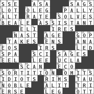 ACROSS 1. Compass dir. 4. White ___ sheet 7. Droops 11. Car dealer's back yard 12. Cassini of fashion 13. Friendly 14. The first octave above the treble staff 15. Assign a rank or rating to 16. Finds the solution 17. Memphis, Tenn. Street 19. Aide 21. Connecticut Ivy Leaguer 23. Angers 24. Political cartoonist Thomas 25. Ripen 26. Republican Party 29. Receives possession of 30. Followers of ems 31. Santa ___, CA 32. Greek goddess of the dawn 33. Big collection agency 34. Directed 35. Health resort 36. _-fi 37. Gurus 40. Snakelike fish 41. Area sheltered from the wind 42. Southern CA. univ. 43. Examine minutely or intensely 45. Environmental prefix 46. Decision 51. Leaves out 55. Foolish or stupid persons 56. Basketball hoops 58. The 19th letter of the Greek alphabet 59. Having high moral qualities 60. Came down and settled, as after flight 61. Three (prefix) 62. Celtic language 63. Part of a journey 64. Baseball player Mel DOWN 1. Broad, flat, thick piece 2. Not divided or shared with others 3. Singer James 4. Wing 5. Stalk of a moss capsule 6. Grows older 7. Table seasonings 8. Inventor's middle name 9. Small, secluded valley 10. System (abbr.) 12. Threatening words 13. Introduce or present, as a question 16. Founders of families 18. Path through which fluid escapes 20. Omens 22. ___ a Wonderful Life 24. Relating to the nose 25. Nest on high 26. An organ shaped like a helmet 27. Washington bills 28. Groovy apt. 29. Drink excessively 32. Compass dir. 33. Ancient Celtic tribe of eastern Britain 36. Narrow boards 37. Take to court 38. Buttonhole 39. Take by theft 43. Took without asking 44. Quote 46. Trig term 47. Aroma 48. Chest bones 49. Relating to the mouth 50. Mediterranean tributary 52. "Tell ____ the Marines!" 53. Small pie 54. Costume for a special activity 57. Russian fighter aircraft