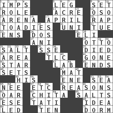 ACROSS 1. Naughty children 5. Part of a journey 8. Put into a specified state 11. Hero or heavy, e.g. 12. 1/640 square mile 14. Bear (Spanish) 15. Sports stadium 17. Showery time 18. Strike 19. Sycophants 21. Corn or form start 22. Third day of the wk. 23. Followers of ems 24. Two (Sp.) 25. Connecticut Ivy Leaguer 27. Black tropical American cuckoo 28. "Beetle Bailey" pooch 31. Table seasoning 35. Compass dir. 37. Passed on 38. Length times width 39. Affectionate concern, for short 41. Went 42. Play the lead 43. Experiment locale 45. Conclusions 46. Puts into a specified state 47. Floor covering 49. Part of HMS, perhaps 51. Compass dir. 52. Ocean 55. Born 57. And so on (abbr.) 60. Thinks logically 62. Rowing implement 63. Riviera of "Kiss of the Spider Woman" 65. Table seasonings 66. Compass dir. 67. Jacques of French films 68. It may be bright or harebrained 69. Directed 70. "___ Little Indians" 71. Dormintory (informal) DOWN 1. Feeling or showing extreme anger 2. Person of subnormal intelligence 3. Entreaties 4. Transmit 5. Pet locale 6. Shade of tan 7. Smile widely 8. Determination 9. He sold his birthright 10. Drink excessively 13. Writer Wiesel 16. Opera by Verdi 17. Help 20. Immeasurably long periods of time 26. Cabin 29. Look after 30. Lyric poems 31. Backtalk 32. Johnson of "Laugh-In" 33. Resembling or made to resemble leather 34. Tarsus (plural) 36. Pipe bend 40. Device for capturing images 44. Object of repulsion 48. Afternoon social gatherings 50. Religious group 52. Twentieth part of a lira 53. Keyboard key 54. Indian state 55. Christmas carol 56. Relaxation 58. Not this but _ 59. Quote 61. Expressed in words 64. Metal container
