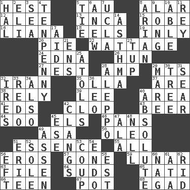 ACROSS 1. Command 5. The 19th letter of the Greek alphabet 8. Having or resembling wings 12. Toward shelter 13. South American Indian 15. Loose flowing garment 16. Woody, climbing, usually tropical plant 18. Snakelike fish 19. In an inward manner 20. Sliced dessert 22. Electrical Measurement 24. Pulitzer Prize-winning author Ferber 26. Attila the _ 27. A home for chicks 28. Electrical Unit 29. Mountains (abbr.) 32. SW Asia republic 35. Spanish pot 37. "We ___ not amused" (Victoria) 38. Trust 39. Area sheltered from the wind 40. Length times width 41. Begley and Asner 42. Hoof sound 43. Fermented drink made from hops 44. "Barney Miller" actor Jack 45. Raised railways 46. Baking dishes 49. White ___ sheet 50. Butter sub 51. Center 55. 100% 56. Greek god of love 57. Went 59. Type of eclipse 63. Do some clerical work 64. Beer foam 65. Jacques of French films 66. Adolescent 67. Cooking vessel 68. Mild oath DOWN 1. Actor Linden 2. Biblical high priest 3. Ocean 4. 3-inch nail 5. Neckwear 6. Afresh 7. Southern CA. univ. 8. Believer in; advocate of (suffix) 9. Having great length 10. Competent 11. Marina Del _, California 14. Respiratory problem 17. Assistant 21. Followers of ems 23. Uncastrated adult male sheep 25. Ringlike coral islands and reefs 28. City in Syria 29. Female horse 30. Relationship diagram 31. Singe 32. Angers 33. Make new 34. In addition 36. Lion 40. Utter; complete 42. Rings like a ship's bell 45. Compass dir. 47. Insect wing 48. 1994 drama film starring Jodie Foster 49. NE Netherlands city 51. 4th largest of the Great Lakes 52. Flatfish 53. Overturn; upset 54. Inside; within (prefix) 56. Bank Draft (abbr.) 58. Eastern Standard Time (abbr.) 60. Tired old horse 61. _ moment's notice (2 wds.) 62. To free from
