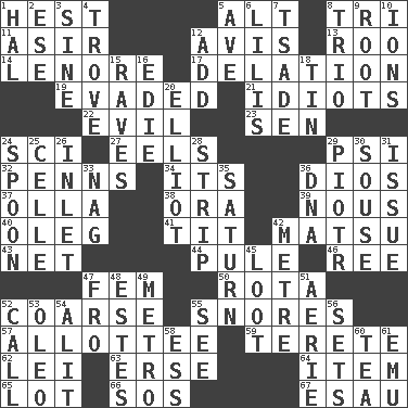 ACROSS 1. Behest 5. The first octave above the treble staff 8. Three (prefix) 11. SW Saudi Arabia district 12. Opinion 13. Friend of Pooh 14. Poe poem 17. Accusation by an informer 19. Eluded 21. Foolish or stupid persons 22. Tending to cause great harm 23. Elected rep. 24. _-fi 27. Snakelike fish 29. 23rd letter of the Greek alphabet 32. Actor Sean's family 34. It is 36. "Vaya con ____" 37. Water jar 38. Mouth or opening 39. Common sense 40. Cassini of fashion 41. Teat (slang) 42. Taiwanese island in East China Sea 43. Fish or hair follower 44. Whine 46. To sift 47. Opposite of masc. 50. Round or rotation of duties 52. Rough 55. Sounds asleep 57. One to whom something is allotted 59. Cigar-shaped 62. Flowery wreath 63. Celtic language 64. Detail 65. Car dealer's back yard 66. Distress signal 67. He sold his birthright DOWN 1. Actor Linden 2. Compass dir. 3. Trig term 4. Collection of objects 5. "___ Maria" 6. Ms. Damita and namesakes 7. Sadhe (variant) 8. Musical group of three 9. Carrot, for example 10. Charged atoms 12. Increase 15. All-night dance parties 16. Singer Brickell 18. Shallow baking pan 20. American author Paul (1891-1958) 24. Soup utensil 25. Cell (Danish) 26. An arm off of a larger body of water 28. Long narrow piece of something 29. Peter (Polish) 30. Lush 31. Come out of 33. Tired old horse 35. Titan orbits this 36. Heredity factor (abbr.) 42. Distance measurement (Brit.) 45. Plunder 47. Back 48. _____ Park, CO 49. Paris' subway 51. Nest on high 52. Give a ring to 53. Margarine 54. Came down and settled, as after flight 55. Observe 56. Arranges properly for use 58. Curvy letter 60. Afternoon social gathering 61. Australian flightless bird